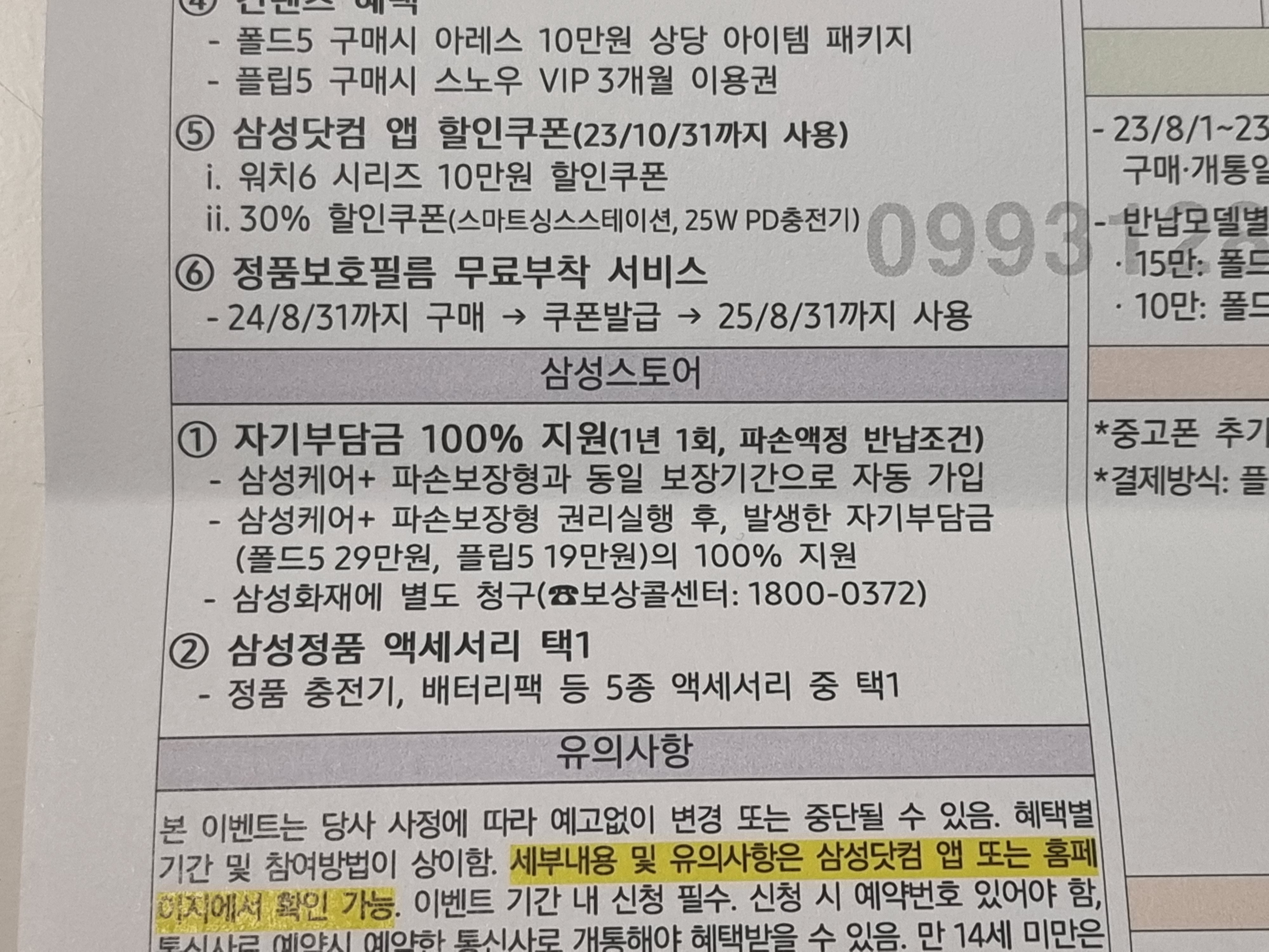 여기에 더해서 삼성스토어에서 사전예약할 경우 추가적인 혜택이 있는데, 자기부담금 100% 지원 1회권이 있습니다. 플립5의 경우 19만원의 자기부담금이 발생하는데 이걸 1회에 한해 100% 지원해주는 혜택이라서 보험용으로 좋은 것 같아요.