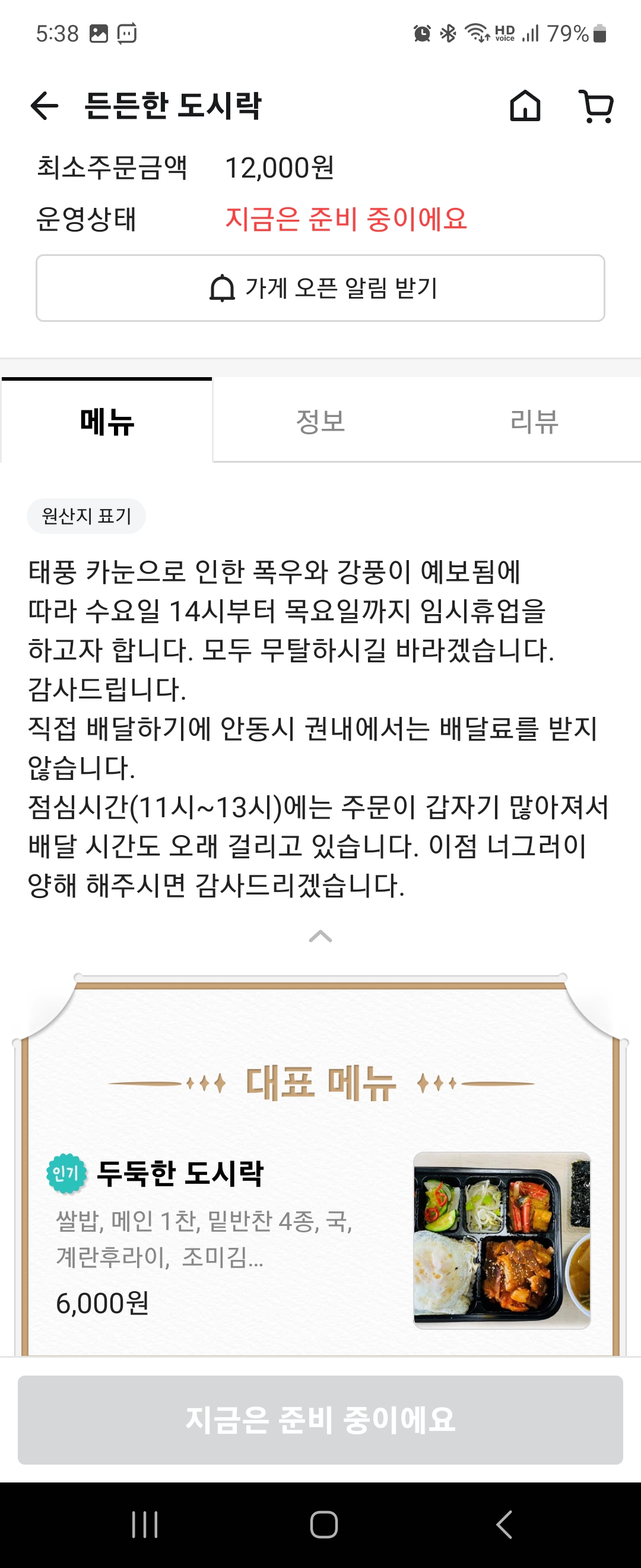 영업시간은 생각보다 짧게 가져가고 있어서 주로 점심 식사용으로 적절할 것 같아요. 그런데 위에 보시면 11시부터 13시 정도까지, 주로 점심시간때에는 배달이 많이 밀리는 듯해서 배달이 꽤 오래 걸릴 수도 있다고 하고 있어요.
