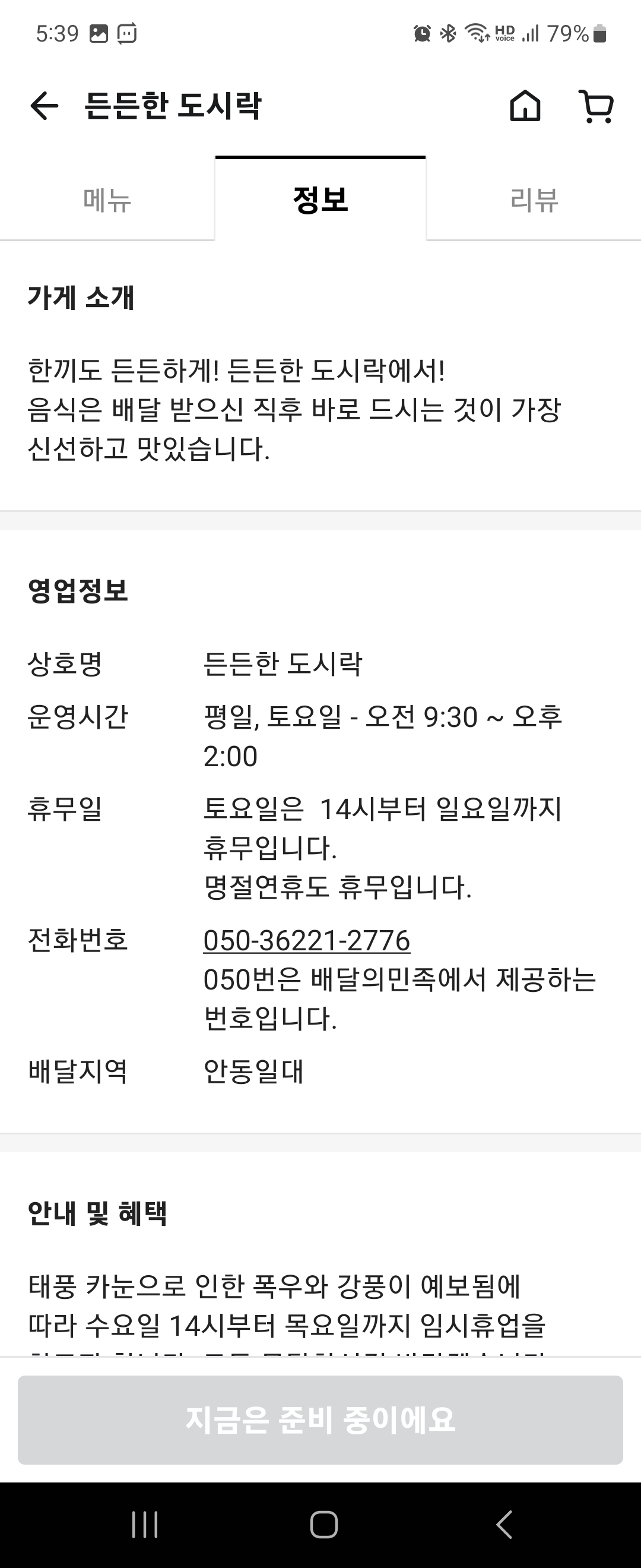 영업시간은 생각보다 짧게 가져가고 있어서 주로 점심 식사용으로 적절할 것 같아요. 그런데 위에 보시면 11시부터 13시 정도까지, 주로 점심시간때에는 배달이 많이 밀리는 듯해서 배달이 꽤 오래 걸릴 수도 있다고 하고 있어요.
