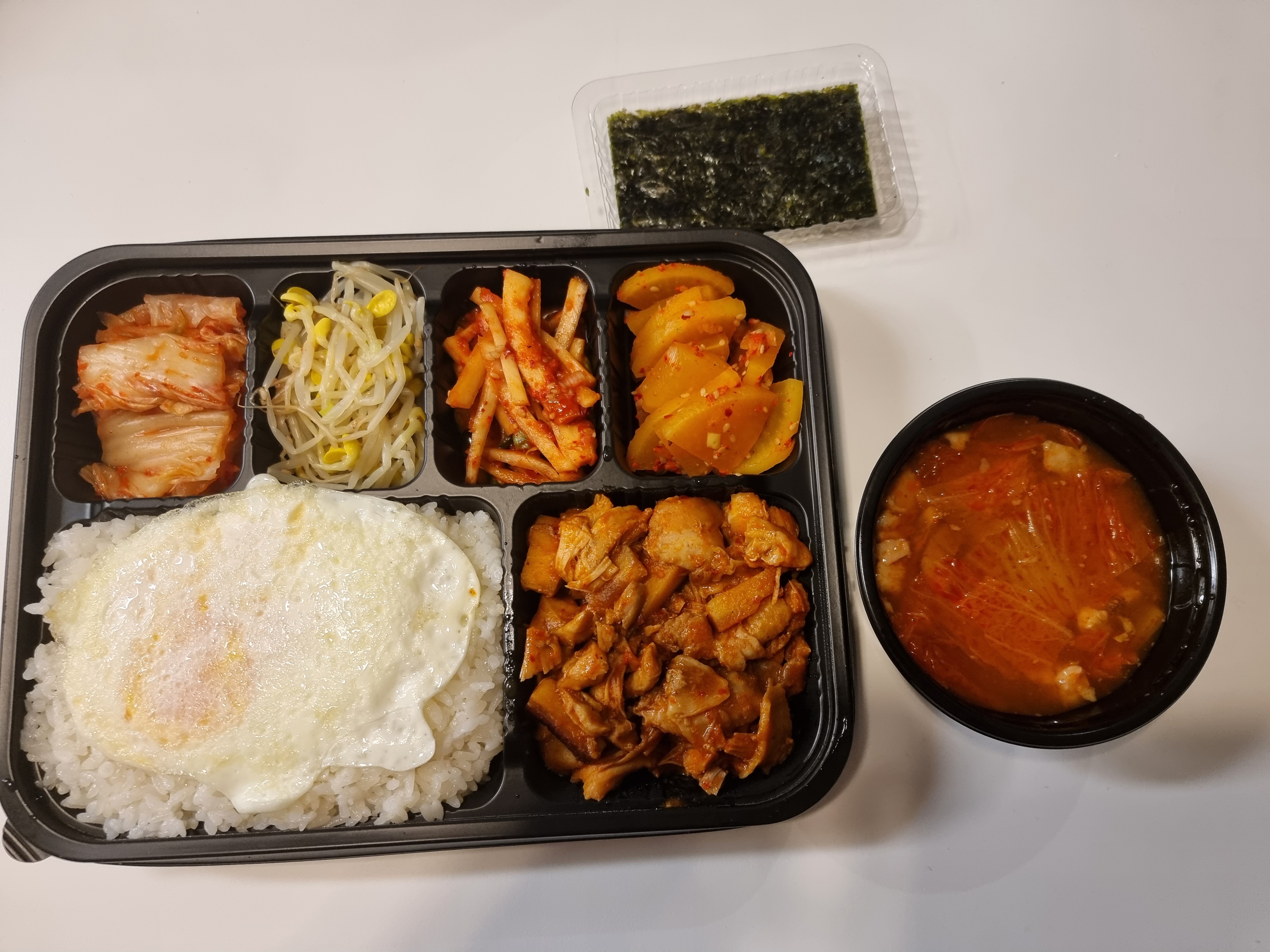 제일 위에 사진에도 있지만... 계란후라이도 하나씩 들어있고, 무엇보다 밥을 정말 도시락 통에 꾹꾹 눌러 넣어주셔서 양도 푸짐한 편이에요.
