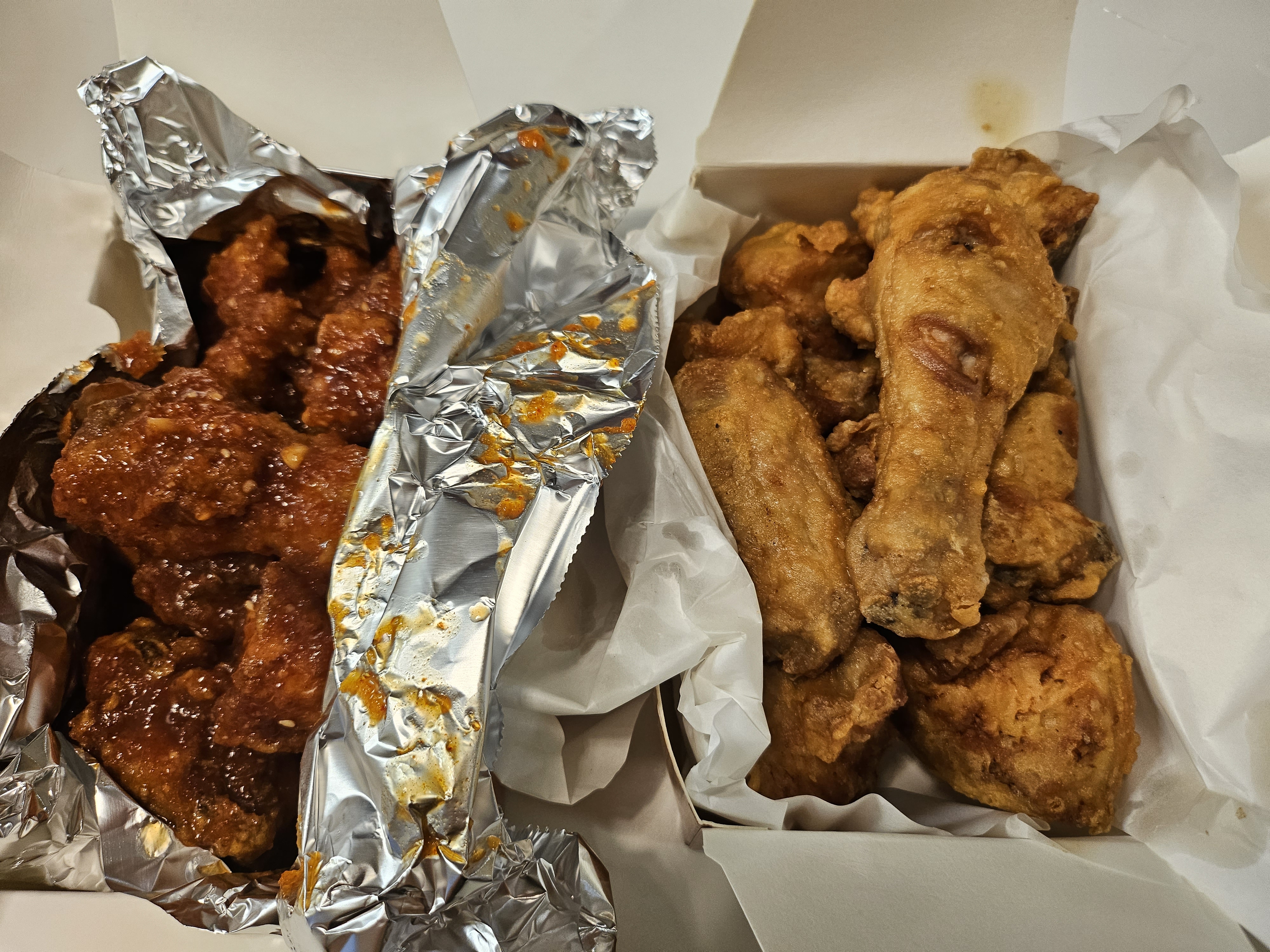 양념반, 후라이드반... 반반으로해서 2만 2천원이었고요. 배달을 시켰습니다. 이곳은 특이하게 배민이나 먹깨비 등에 등록돼 있지 않아서 전화로 배달 주문하였어요. 약간 옛날 방식이었는데 ㅎㅎ 추억의 방식이죠.