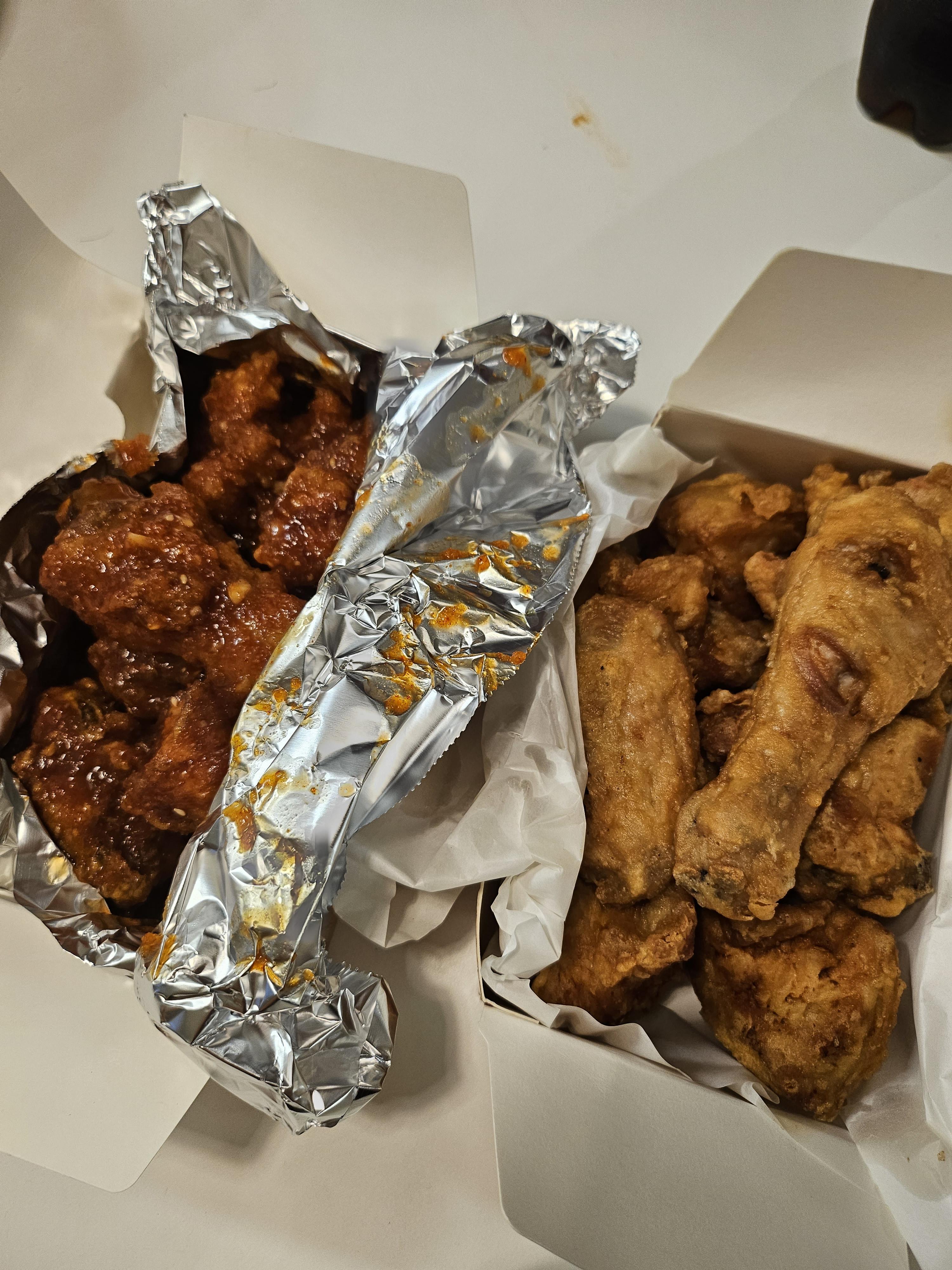 양념반, 후라이드반... 반반으로해서 2만 2천원이었고요. 배달을 시켰습니다. 이곳은 특이하게 배민이나 먹깨비 등에 등록돼 있지 않아서 전화로 배달 주문하였어요. 약간 옛날 방식이었는데 ㅎㅎ 추억의 방식이죠.