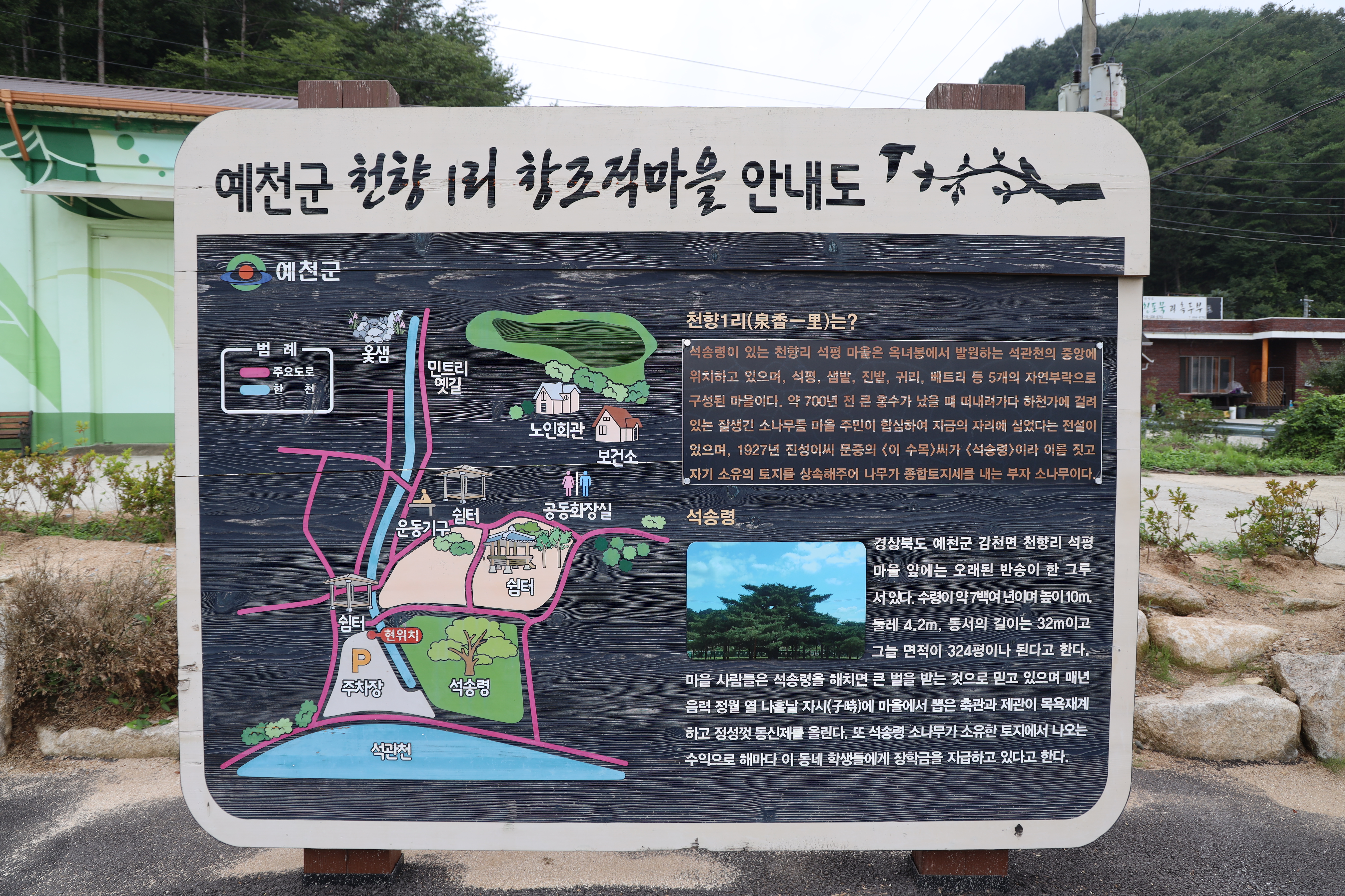 여기 주변 마을은 천향1리 창조적마을이라고해서 천향1리 마을입니다. 석송령으로 유명한 마을인데요. 옻샘과 쉼터, 석관천, 석송령, 노인회관과 보건소, 공동화장실 등의 시설을 갖추고 있습니다.