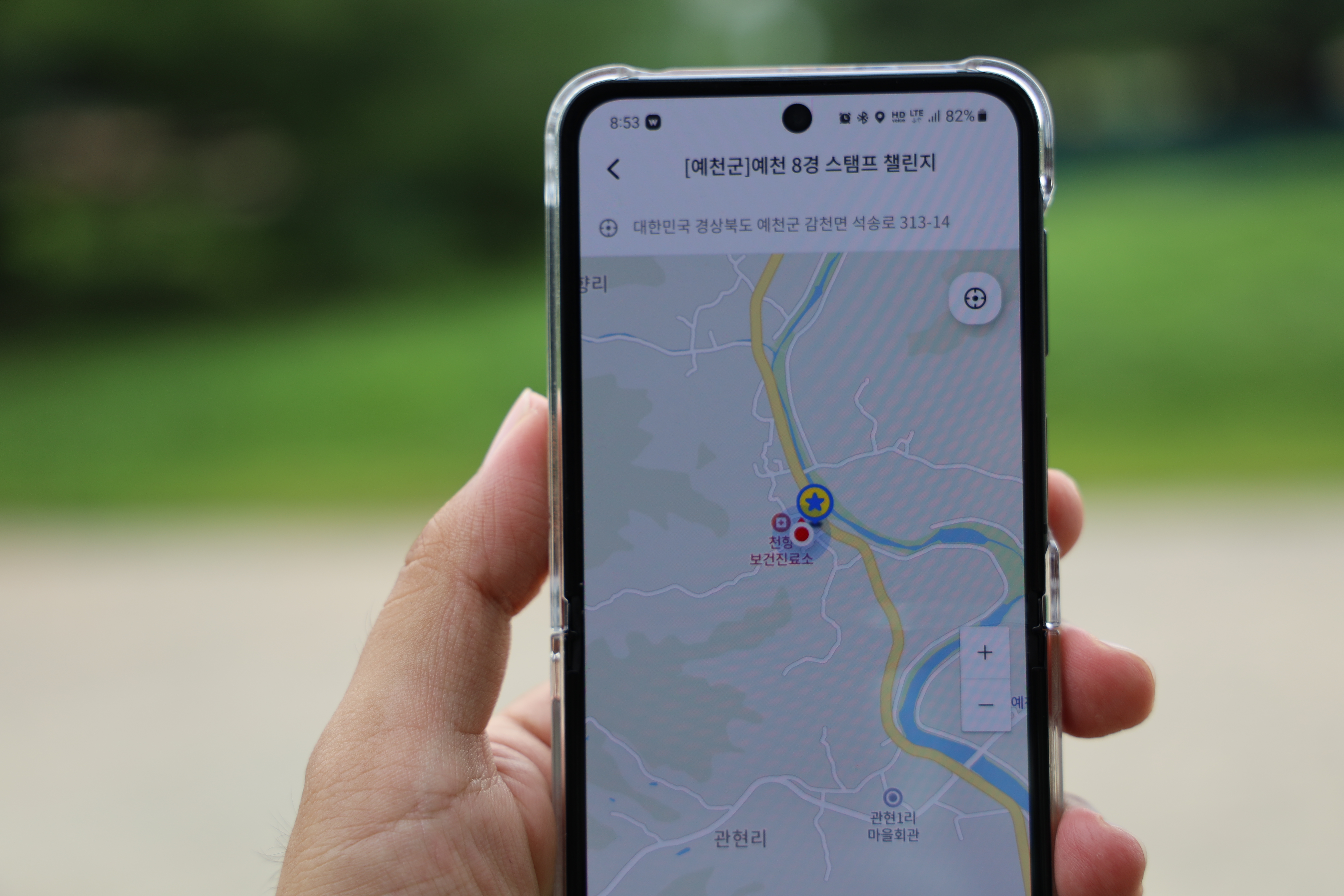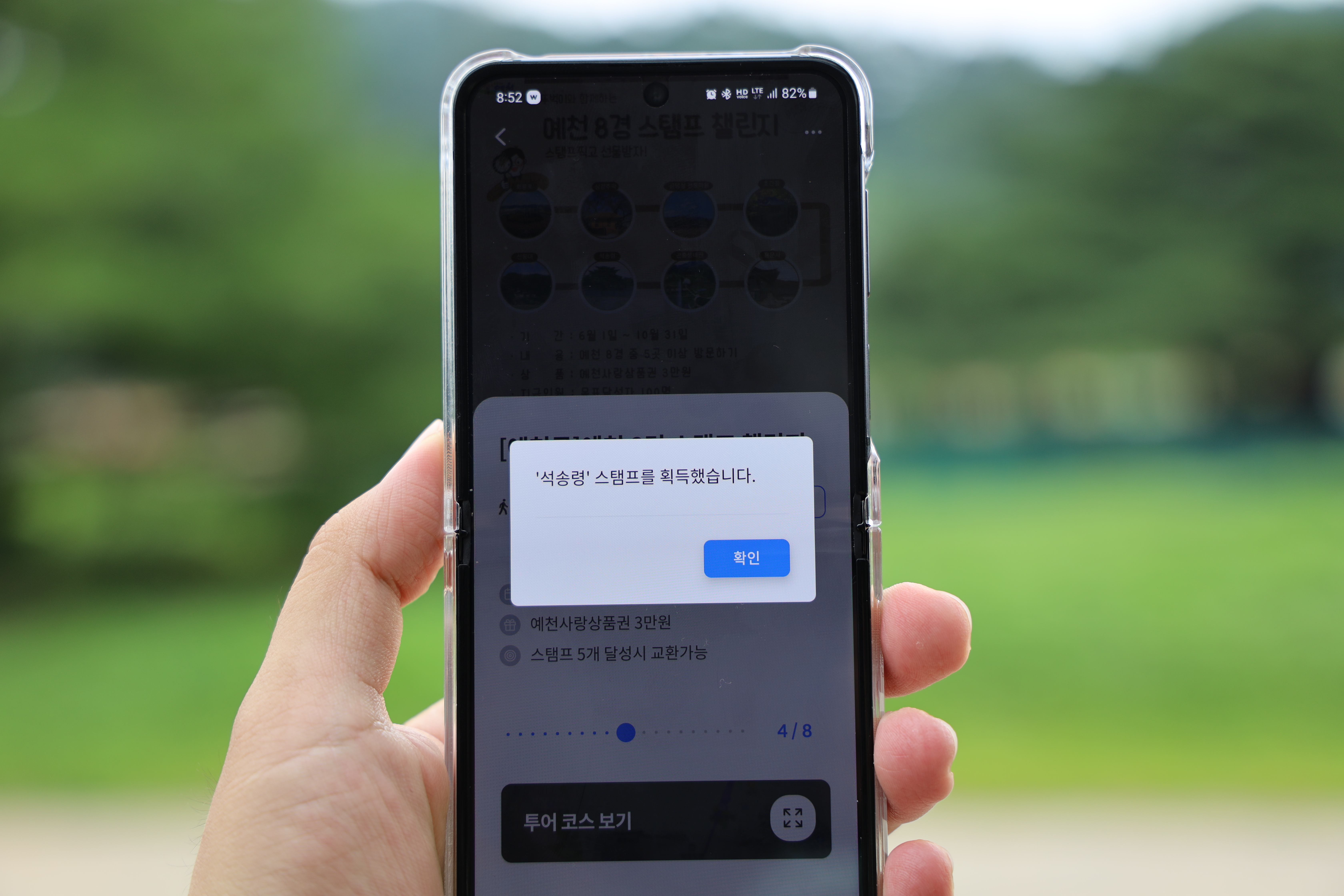 석송령에서 뚜벅이 챌린지 스탬프를 획득하였습니다. 원래는 뚜벅이챌린지 워크온 앱에서 근처에 가야만 스탬프가 획득이 되는데, 석송령에서는 주차장쪽에서도 스탬프가 획득될 정도로 거리가 가깝습니다.