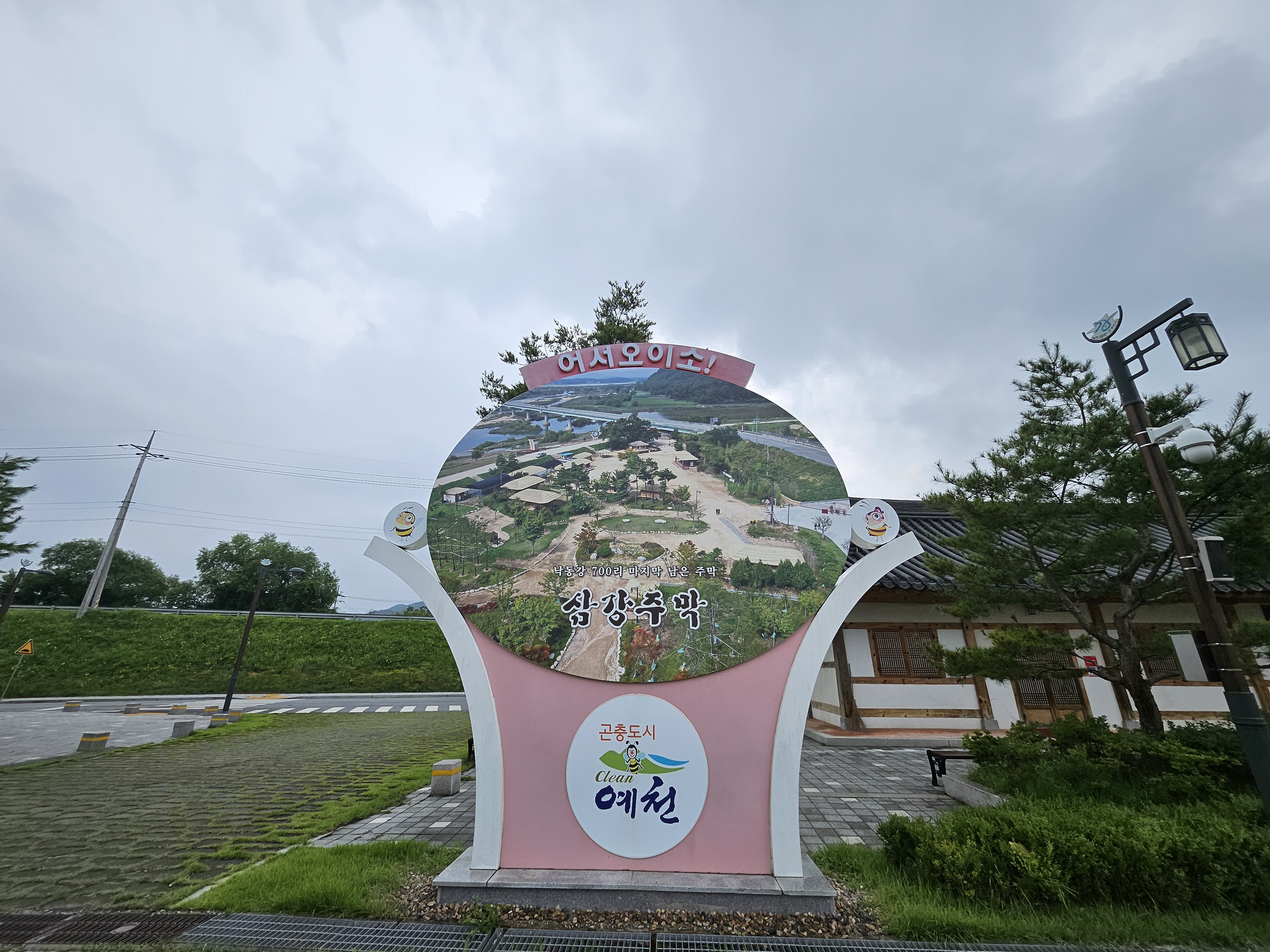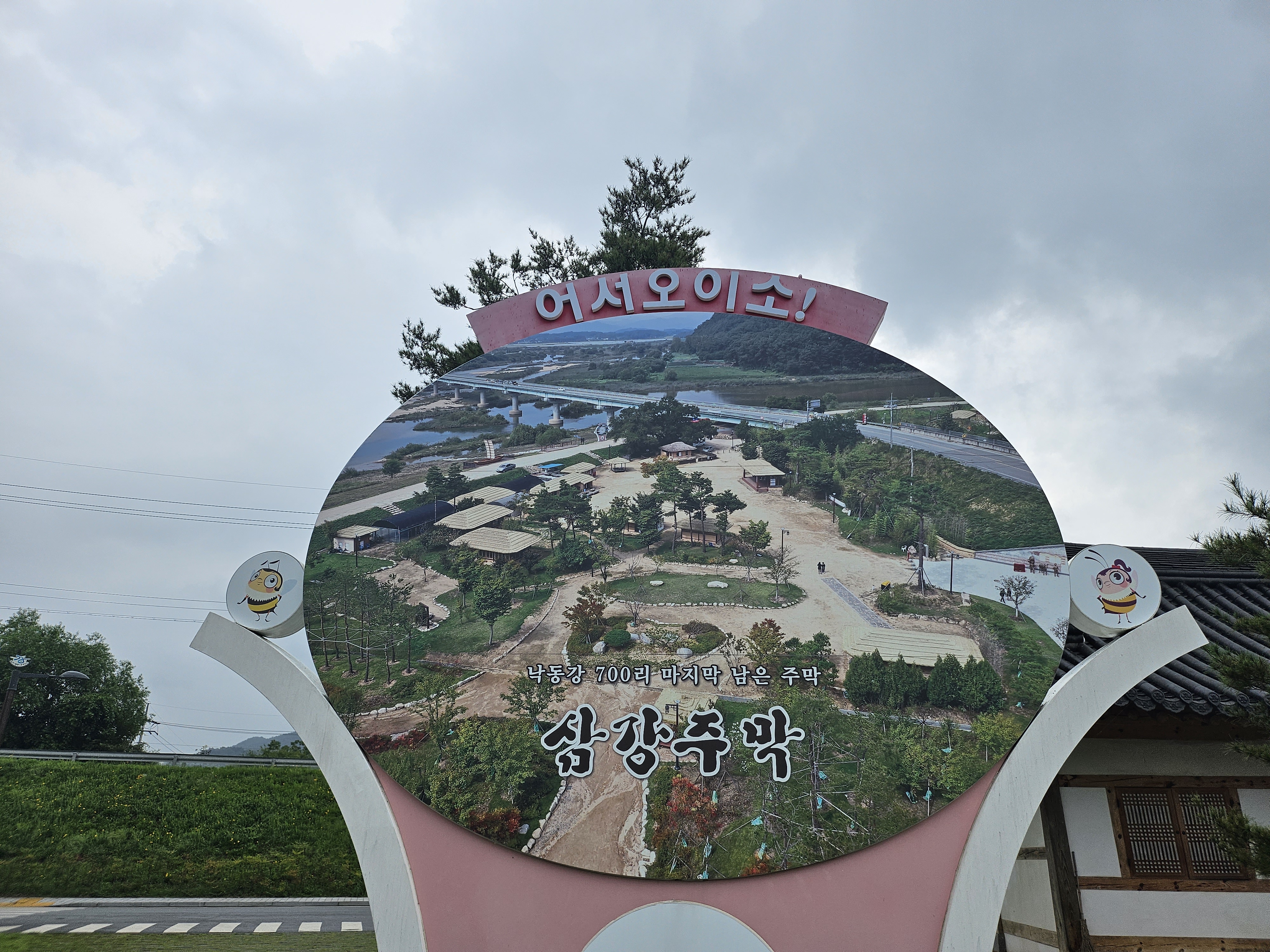 삼강주막 주차장에 있는 어서오이소! 삼강주막의 사진이 바뀐 것 같아요. 삼강주막 전체 전경을 보여주는 사진으로 깔끔하게 표현되어 있는 모습입니다.