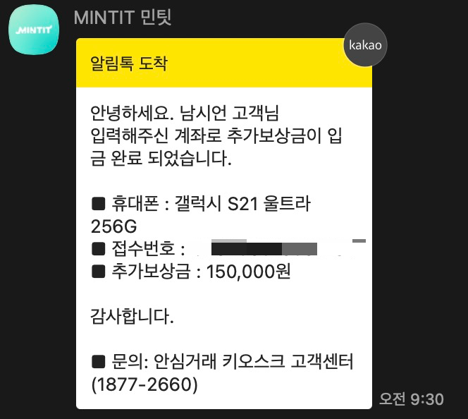 다른분들 후기를 보니까 금액이 추가보상금까지 포함해서 한꺼번에 들어온다고 했었던 것 같은데, 저같은 경우에는 먼저 민팃에서 휴대폰 금액이 먼저 입금되고, 몇 분 후에 추가보상금이 따로 입금되더라고요. 이 몇분간 추가보상금 제대로 입금안되면 어쩌나...하면서 걱정 조금 했었는데요 ㅎㅎ