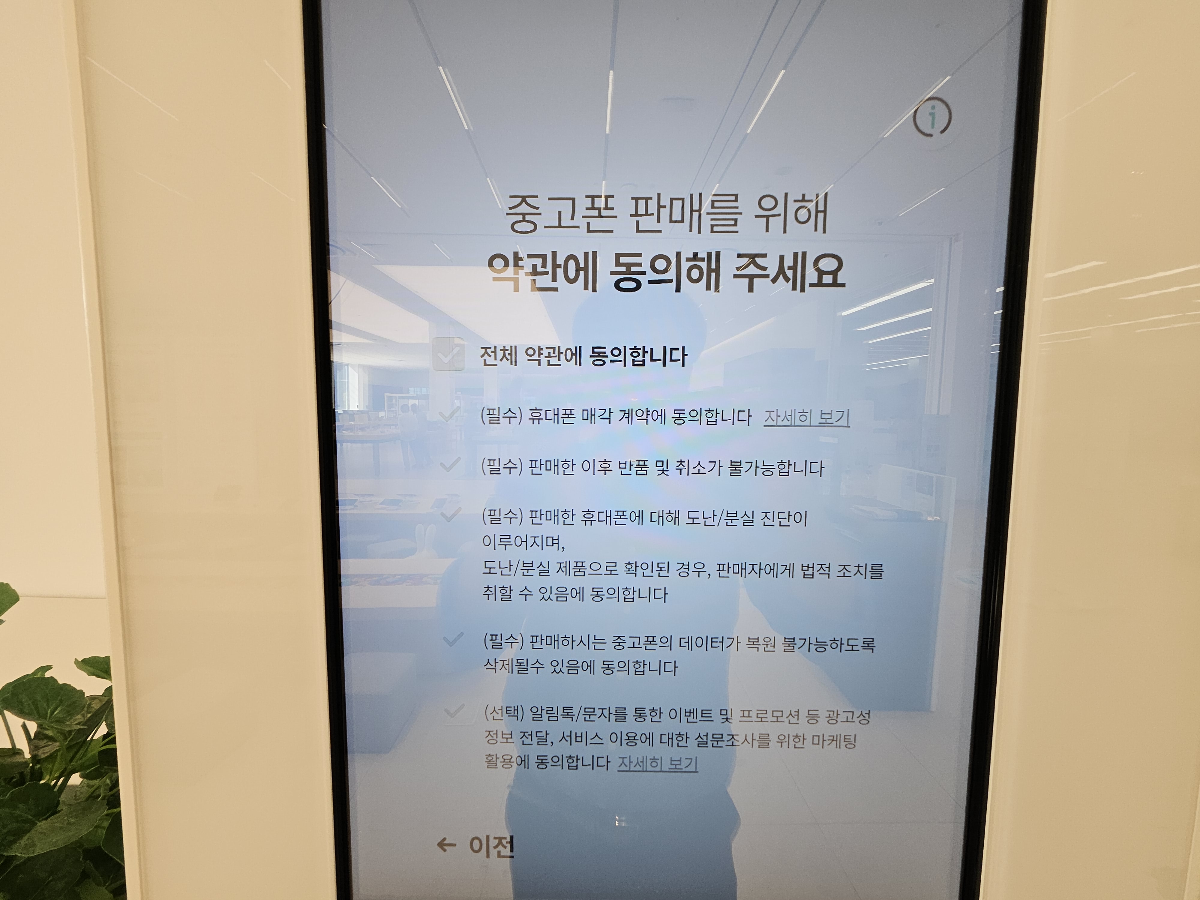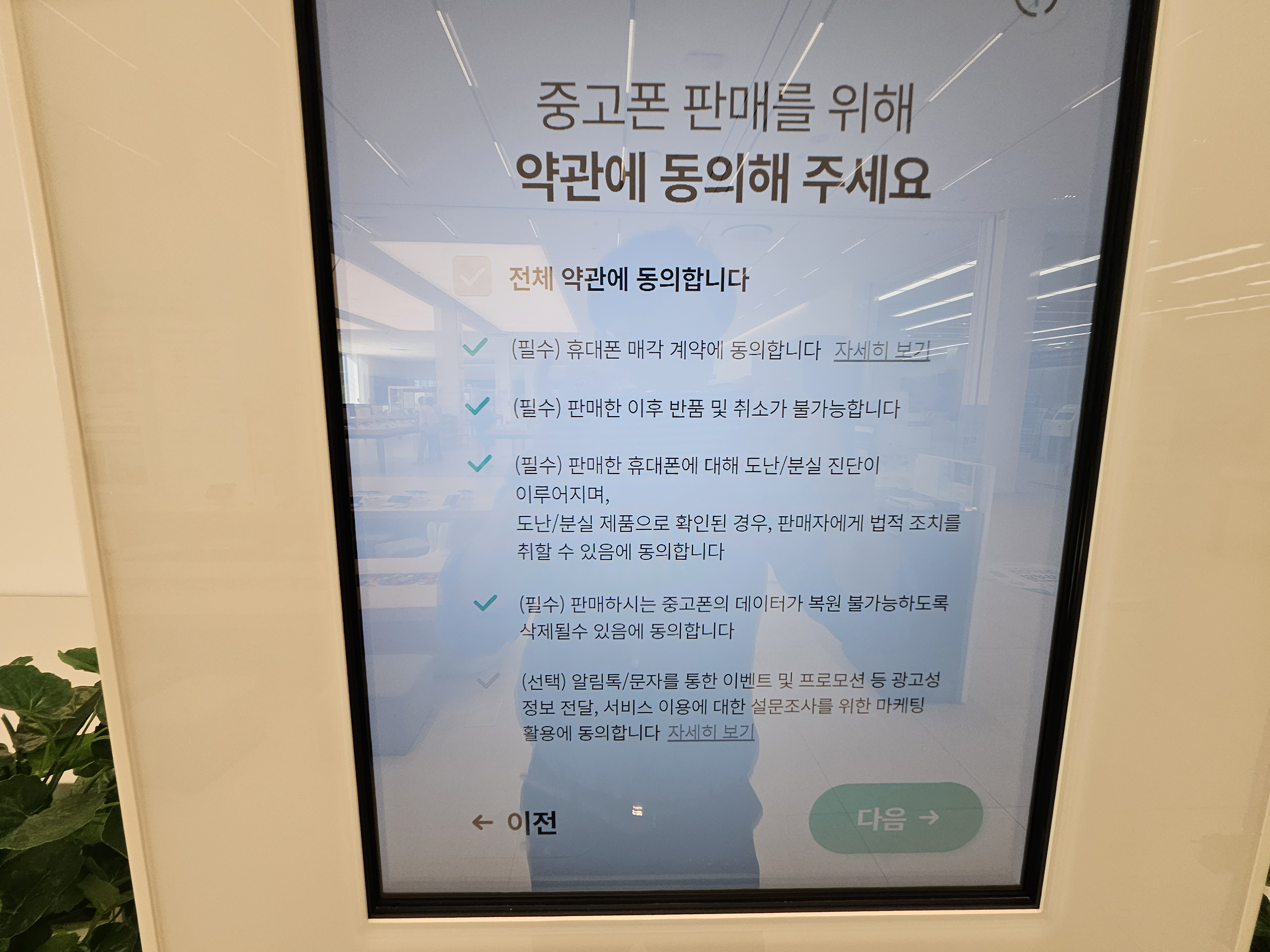 이제 판매 버튼을 누르고 중고폰 판매를 위한 약관에 동의를 해줍니다. 여기에서 제일 밑에 선택 약관이 있으니 참고하세요.