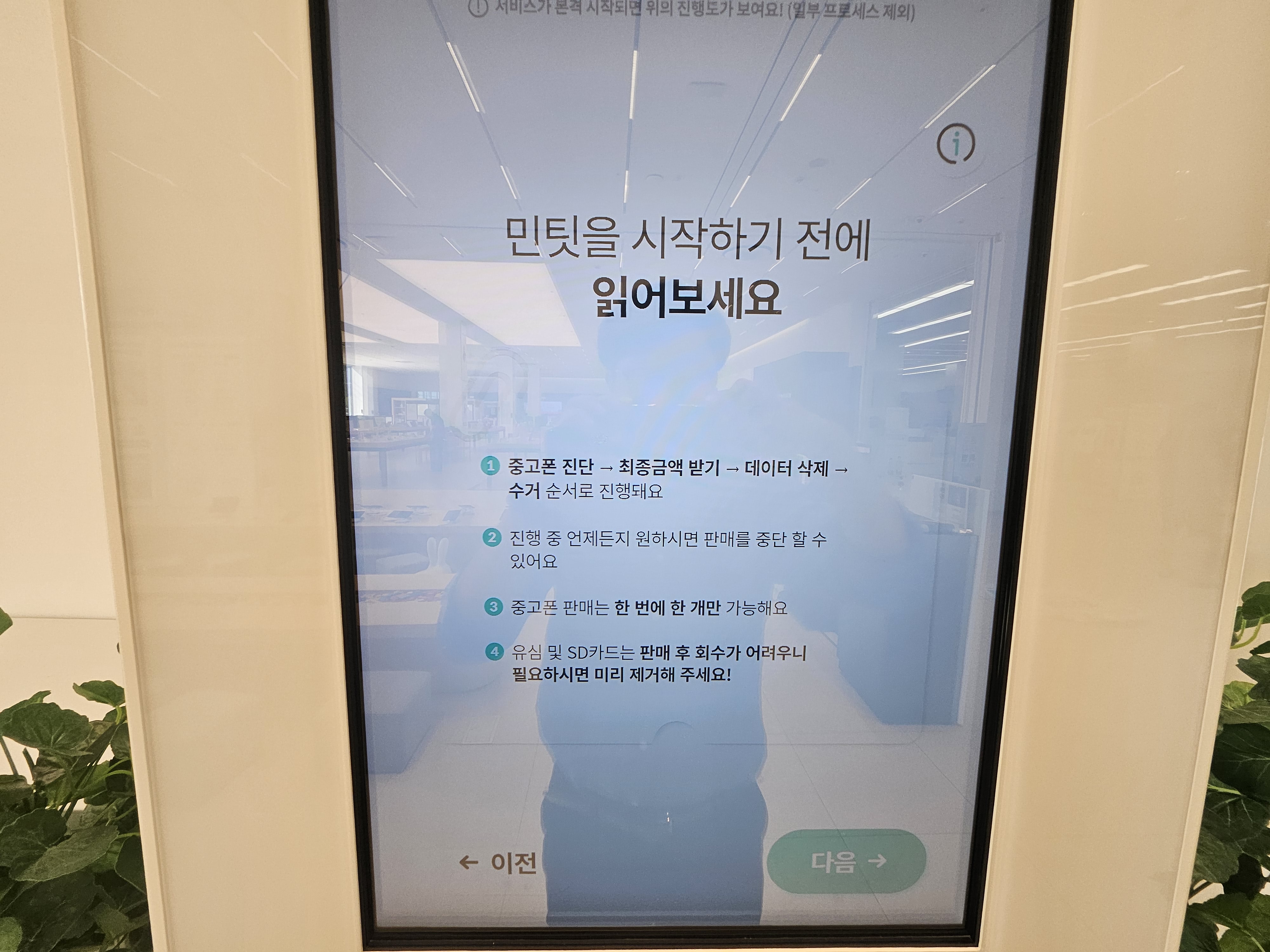집에서 가까이에 있는 삼성스토어에 민팃 기계가 있어서 민팃으로 기존에 쓰던 폰 반납하고 삼성 Z플립5 사전예약을 통해 받을 수 있는 혜택 중 하나인 트레이드인 추가보상금 받고 왔습니다.