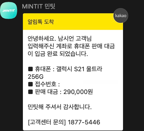 그러면 여기에서 카톡으로 계좌번호 입력하는 창이 나오고 계좌정보를 정확하게 입력해주면 민팃 중고폰 판매가 끝나게 됩니다.