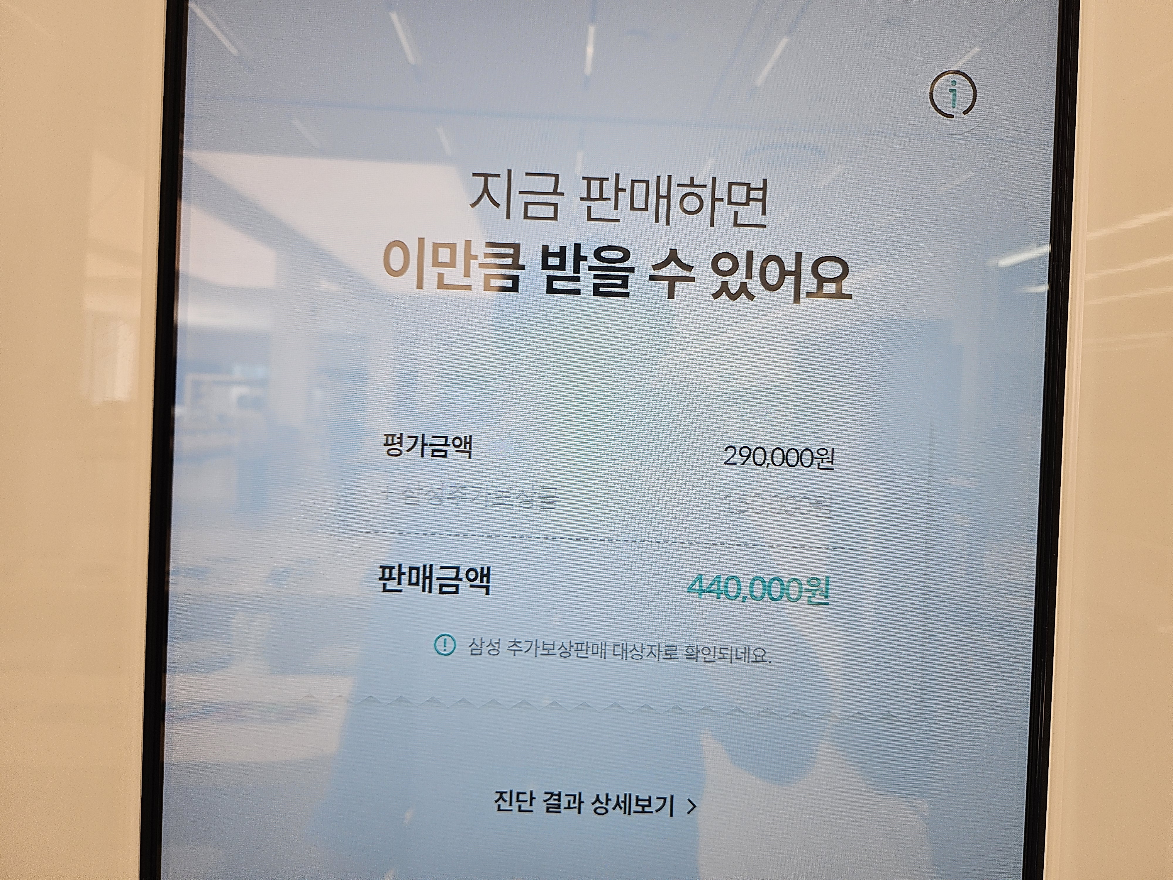 제 폰은 가격이 이렇게 나왔네요. 갤럭시 S21 울트라의 경우 최대 금액이 35만원이었고요. 한 단계 아래가 29만원이었는데 제건 아마 B급이 뜬 것 같아요. 여기에 추가보상금으로 15만원이 붙어서 총 44만원을 받을 수 있다고 합니다.