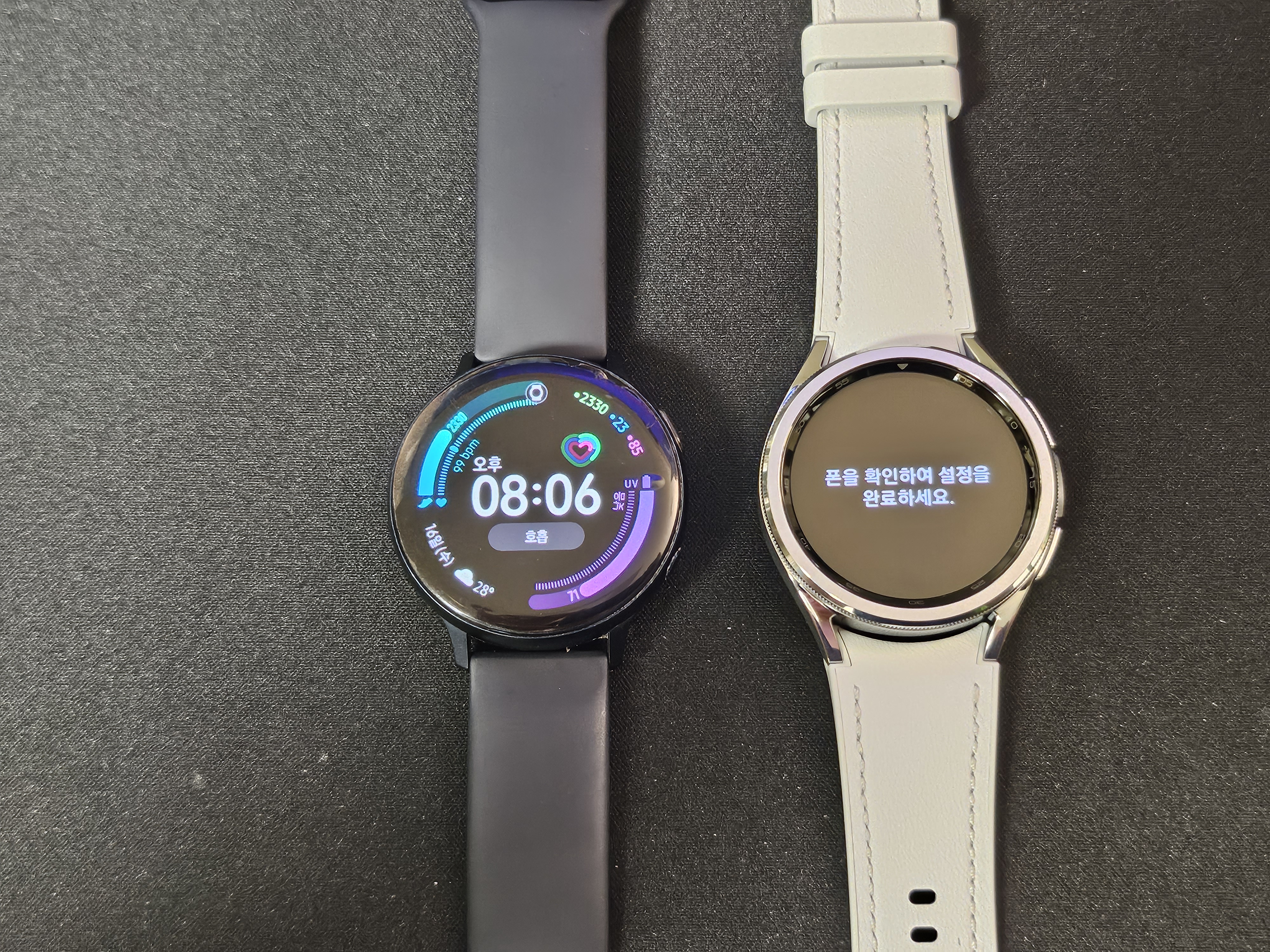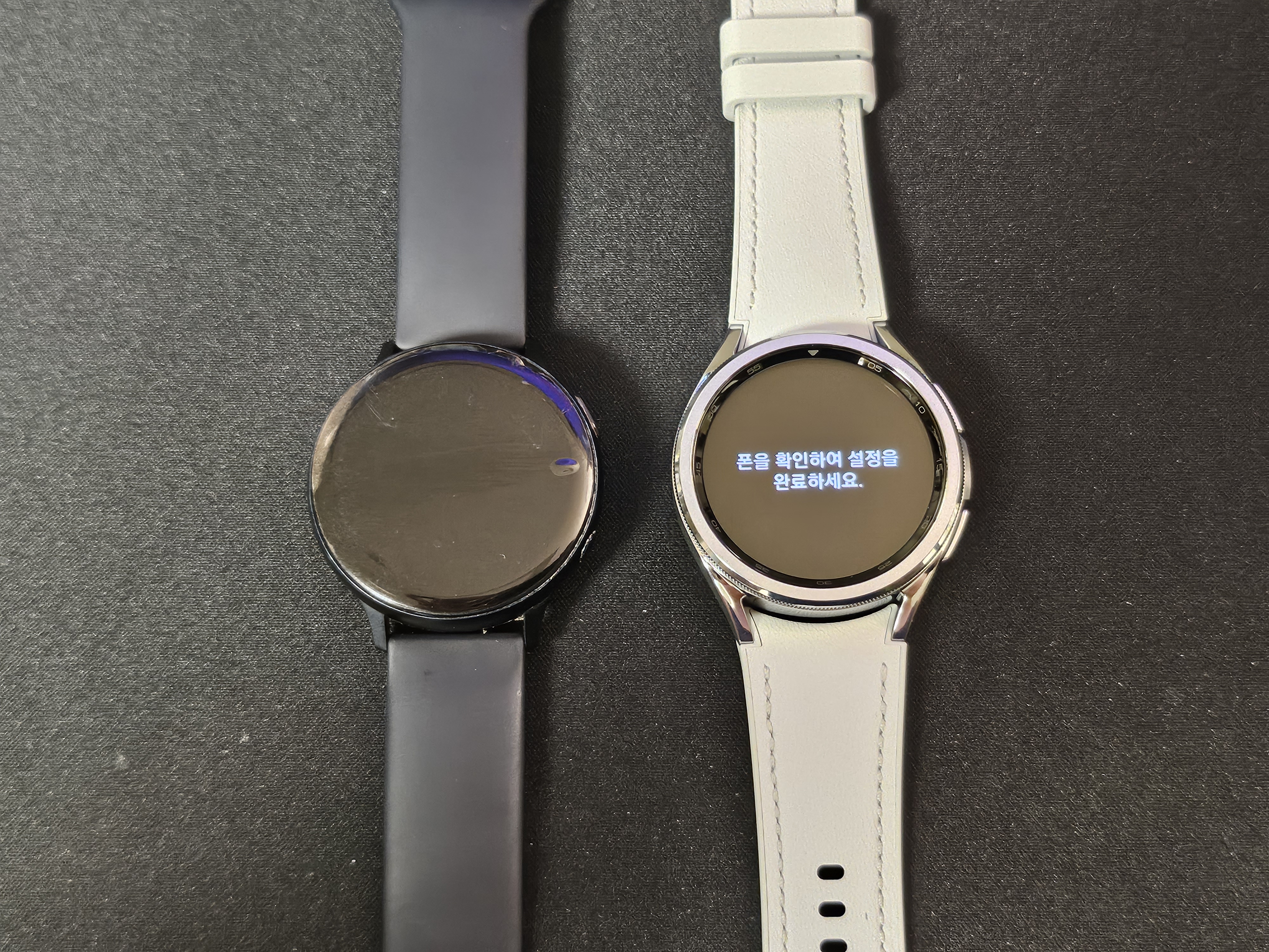 기존에 쓰던 액티브2와 비교샷. 왼쪽에 액티브2이고 오른쪽은 워치6클래식 43mm입니다. 베젤이 줄어들어서 화면 크기 자체는 거의 비슷해보이고요. 클래식은 베젤링이 있어서 뭔가 좀 더 묵직해보이고 고급스러워보여서 좋긴 하네요 ㅎㅎ