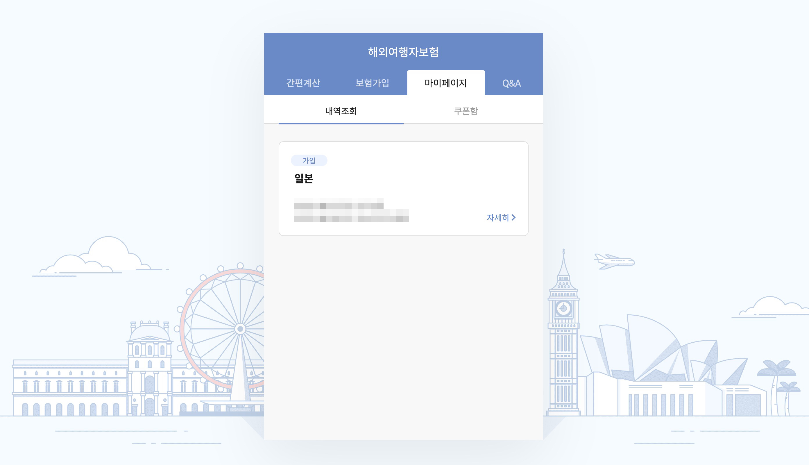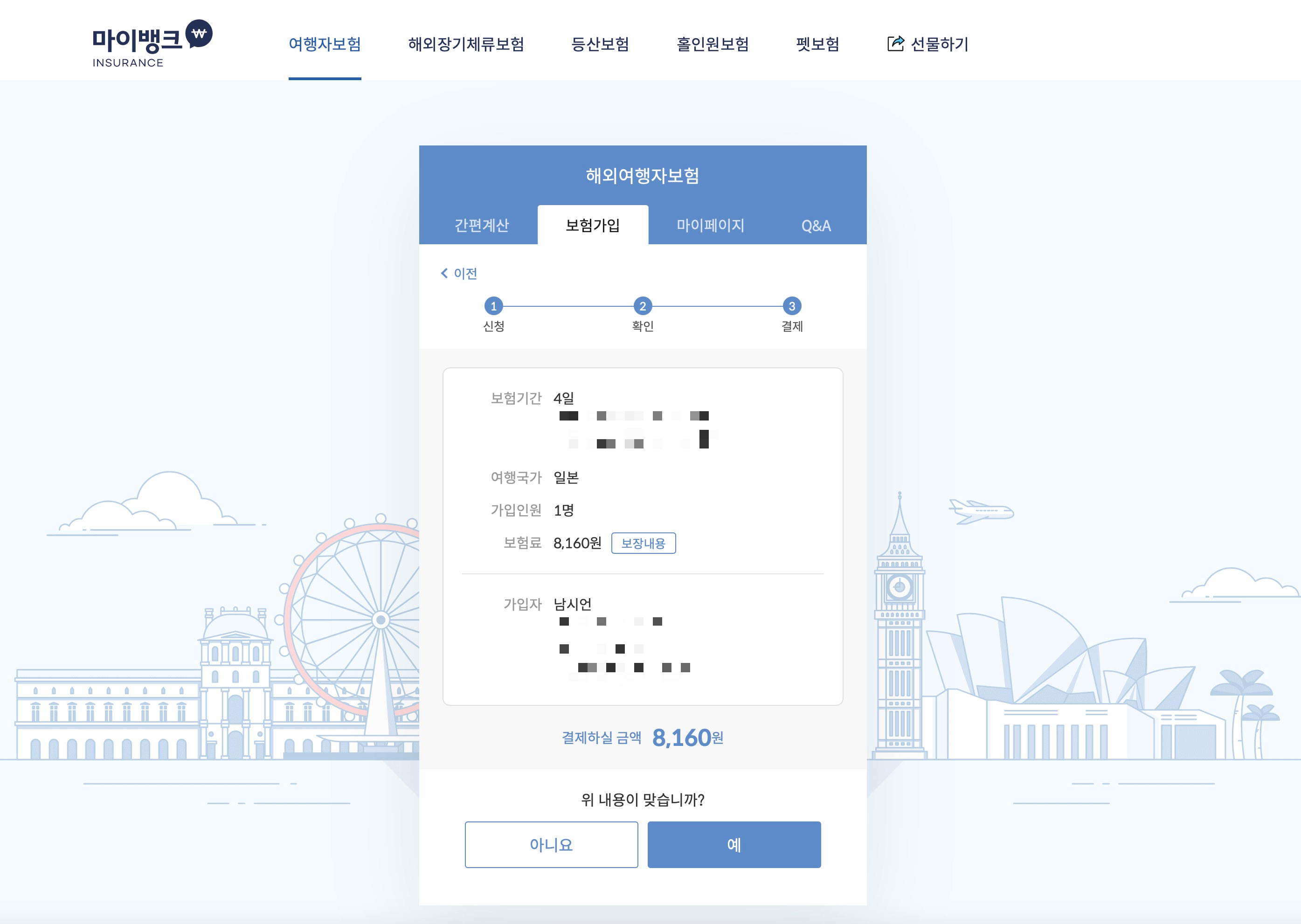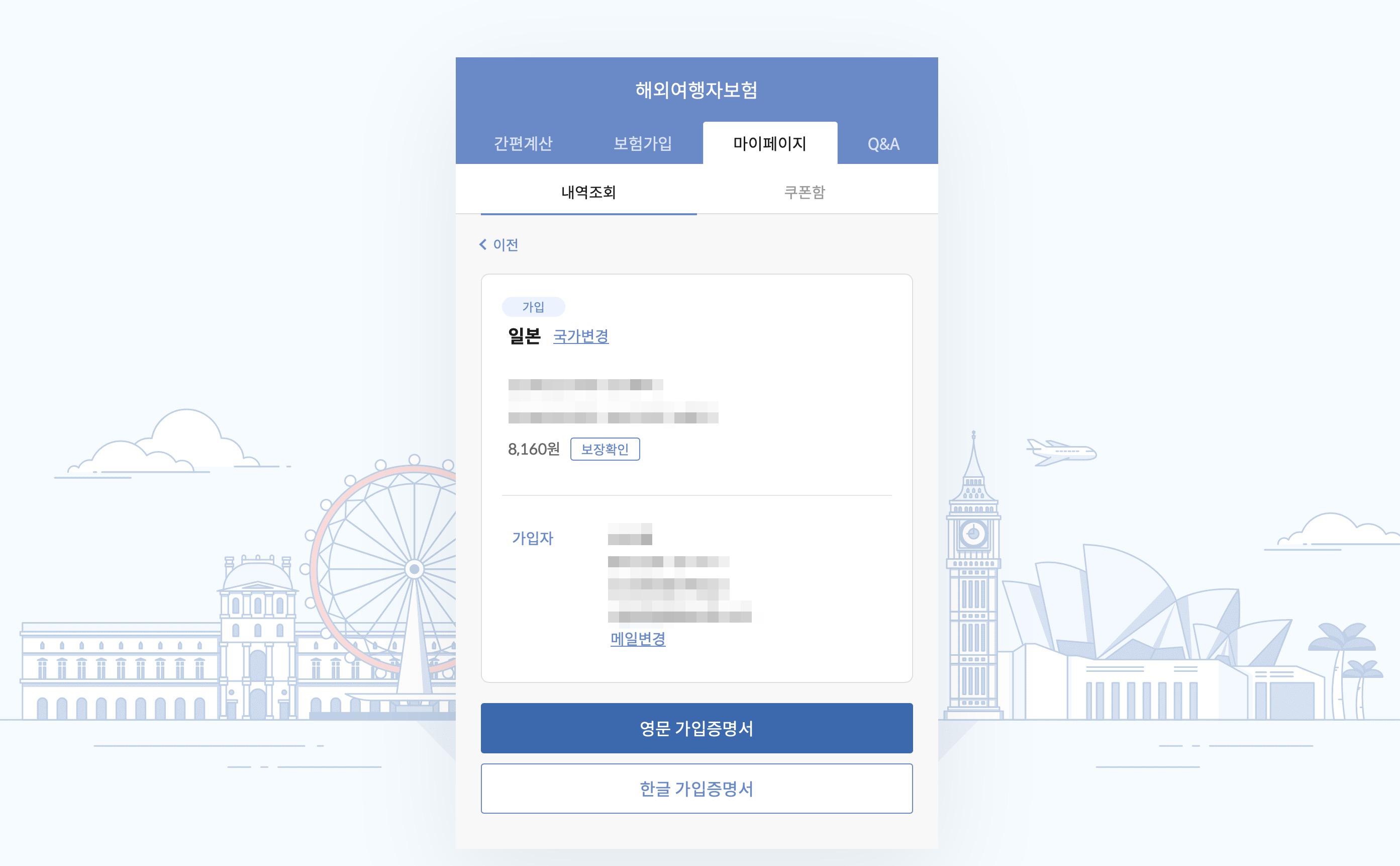 간편 계산 탭에서 주민등록번호 앞자리와 여행 국가, 여행 기간을 입력하면 예상금액을 볼 수 있습니다. 일본 여행 기준, 만 36세 남자, 4일 여행 기준으로 8,160원으로 부담스럽지 않은 가격입니다.
