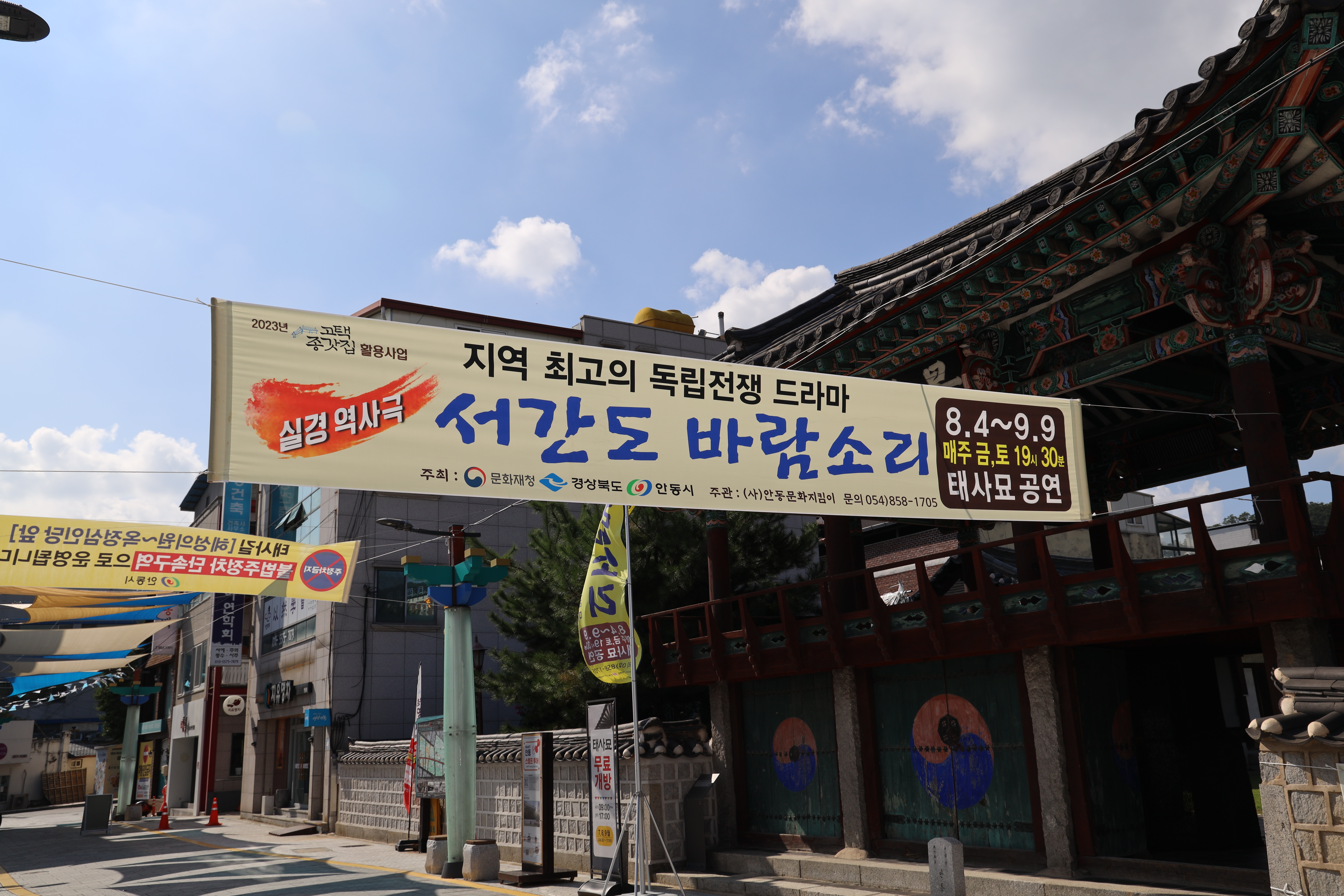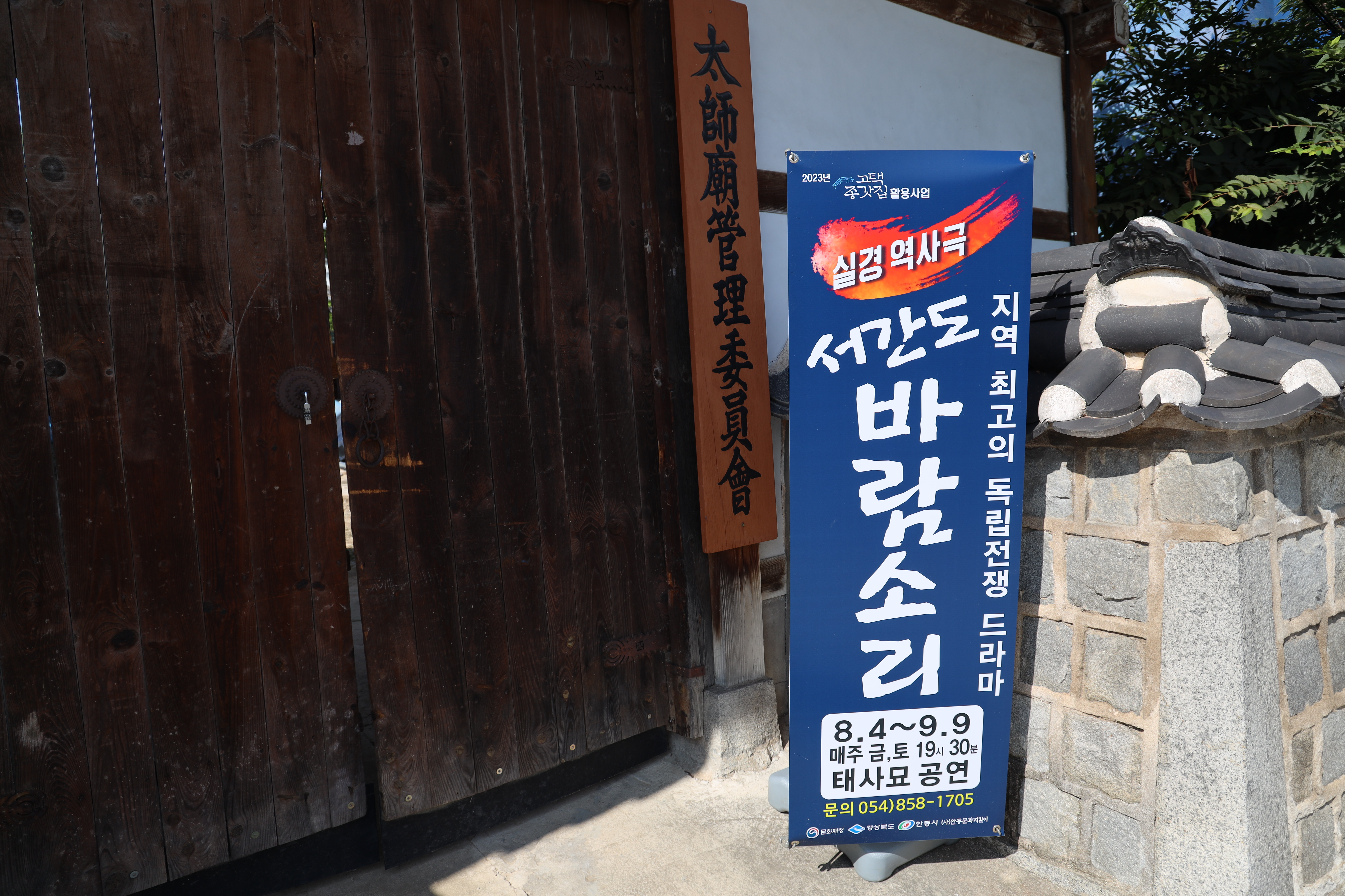 태사길 플리마켓에서 함께 둘러볼 수 있는 태사묘에서는 서간도 바람소리라고 하는 실경 역사극 공연도 열립니다. 매주 금요일과 토요일 저녁 7시 30분부터 열리며 미리 예매를 해야한다고 합니다. 당일 현장에서 구매하면 1만원이며 지역사랑상품권 5000원을 되돌려줍니다. 서간도 바람소리는 원래 임청각에서 공연되었으나 현재 임청각이 공사 중이라서 태사묘에서 공연이 열리는 것으로 보입니다.
