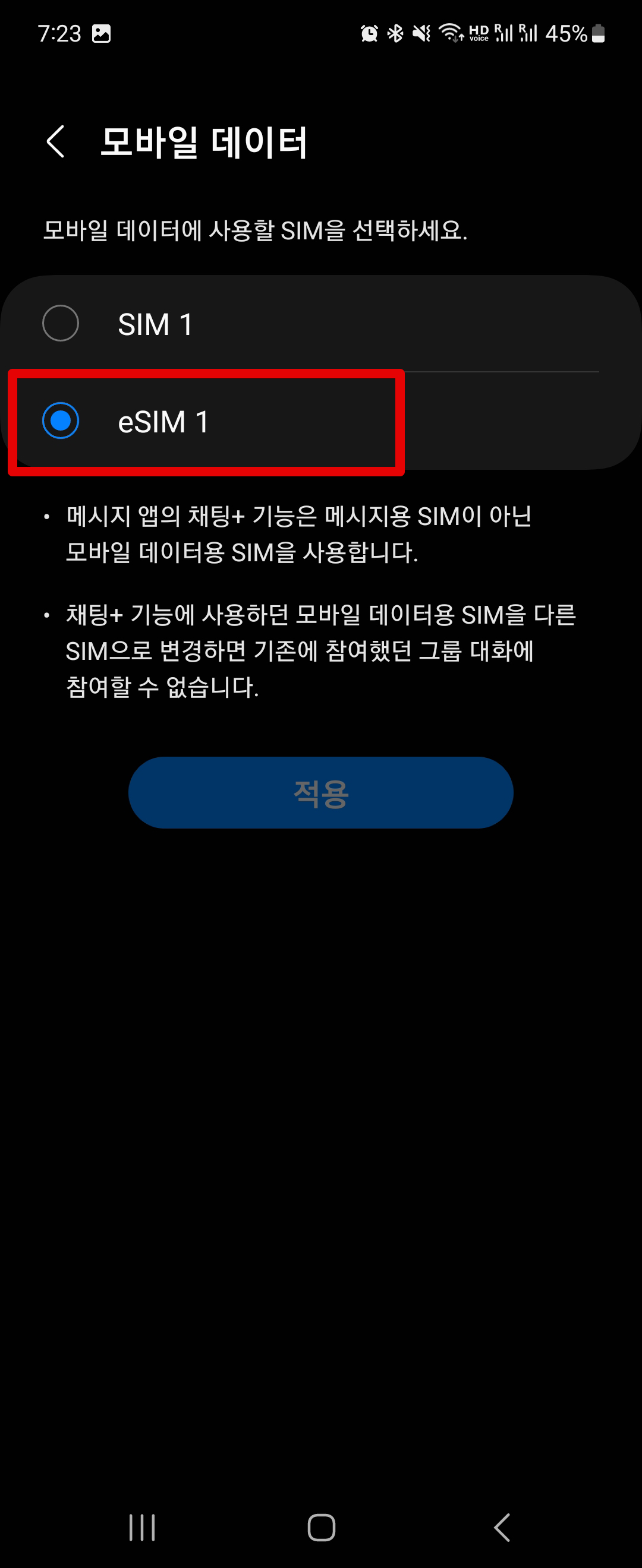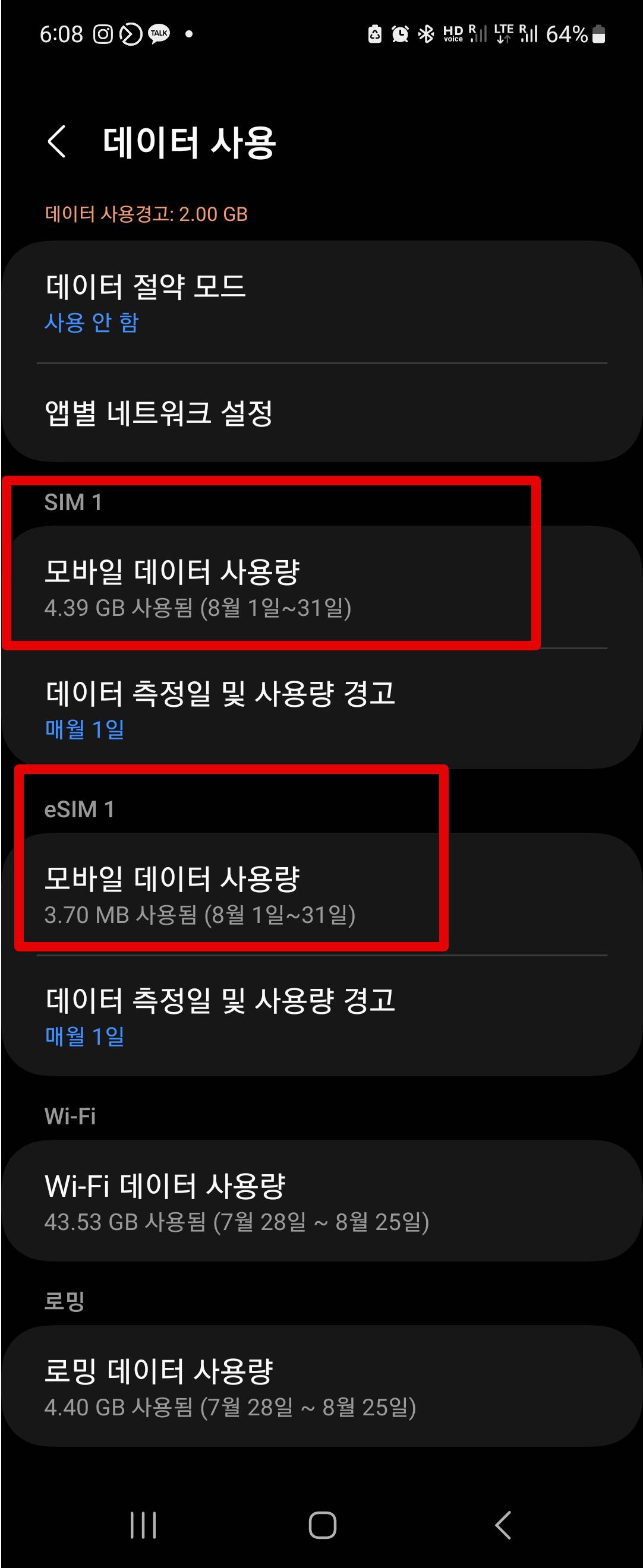 데이터 eSIM을 설정해서 써보니까 좀 재미있더라고요. 일단 [데이터 사용] 설정에서 기존 유심인 SIM 1이 있고, 새롭게 추가한 eSIM 1이 있습니다. 여기에서 데이터 로밍이 어떻게 되는지 보려면, SIM 1에서 데이터 사용량이 멈춰져 있는것과 아래쪽에 eSIM 1 항목에서 모바일 데이터 사용량이 늘어나는지를 체크해가지고, 정상적으로 데이터만 eSIM으로 연결되고 나머지 전화나 이런것들은 기존 SIM1으로 작동되는지 체크해보면 되더라고요.