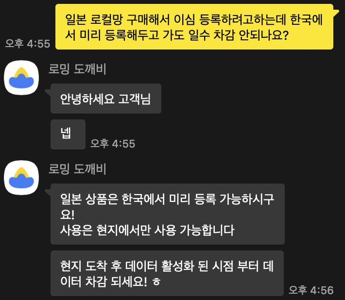 일본의 경우 현지에서 통신이 연결되는 순간부터 데이터 로밍이 시작이 되기 때문에 eSIM을 미리 등록해두어도 된다고 답변받았어서 그렇게 했습니다. 카카오톡 문의도 굉장히 친절하고 빠르게 응대를 해주시더라고요.