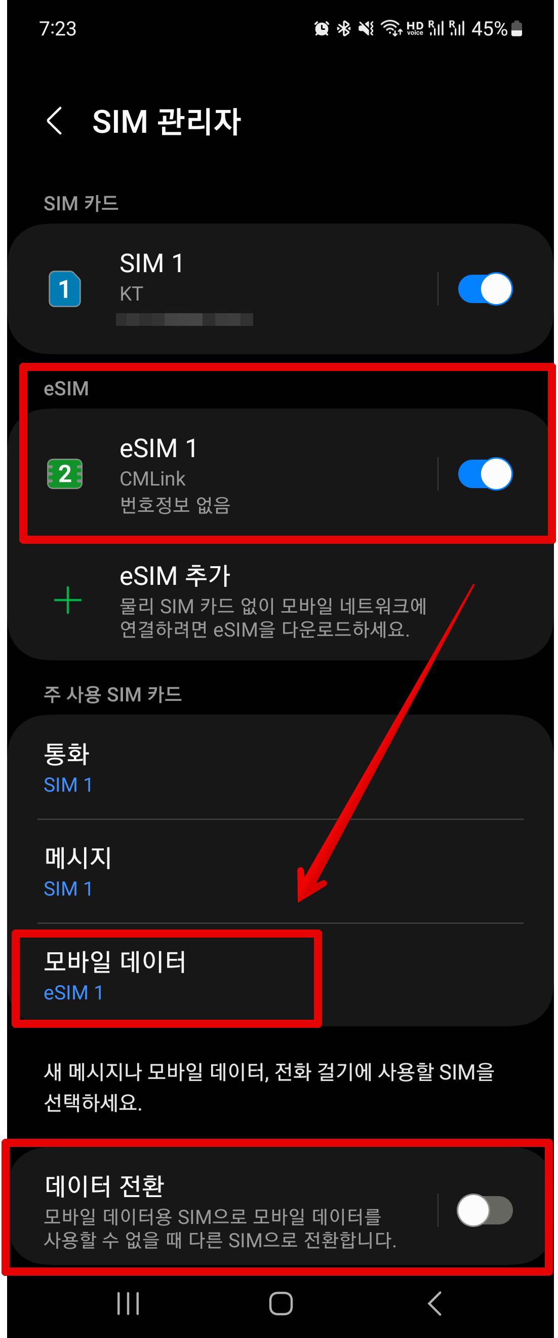 로밍도깨비 eSIM 데이터 로밍을 처음 써보다 보니까 처음에 조금 헷갈리더라고요. 저는 위와 같이 설정해서 잘 사용했었어요. 일단 설정에서 SIM 관리자로 들어간 다음에 모바일 데이터를 eSIM 1으로 바꿔줍니다. 그리고 해외로밍 탭에서는 데이터 로밍을 끄면 통신이 안되는것 같더라고요. 그래서 데이터 로밍을 켜주었고요. 아래쪽에 데이터 전환의 경우, 내용을 읽어보니까 기존 심으로 로밍이 연결될 수도 있을 것 같아서 이 부분은 꺼두었는데 데이터 잘 터졌어요.