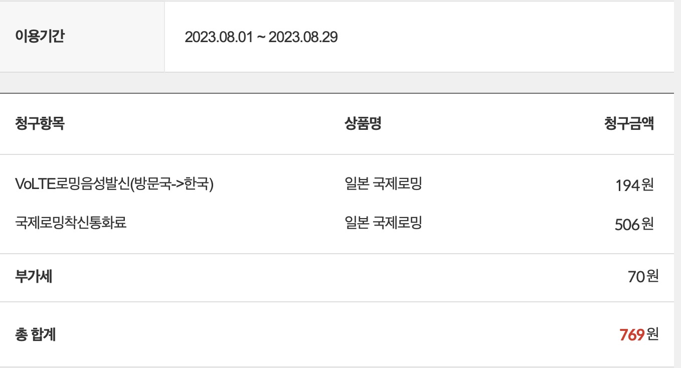 KT 홈페이지에서는 실시간 요금을 확인해볼 수 있는데, 로밍 요금, 저의 경우 전화 통화 5번인가 7번인가 했었고, 제가 잠깐 걸었던적도 있었는데 다 합쳐서 약 770원 정도 나왔네요.