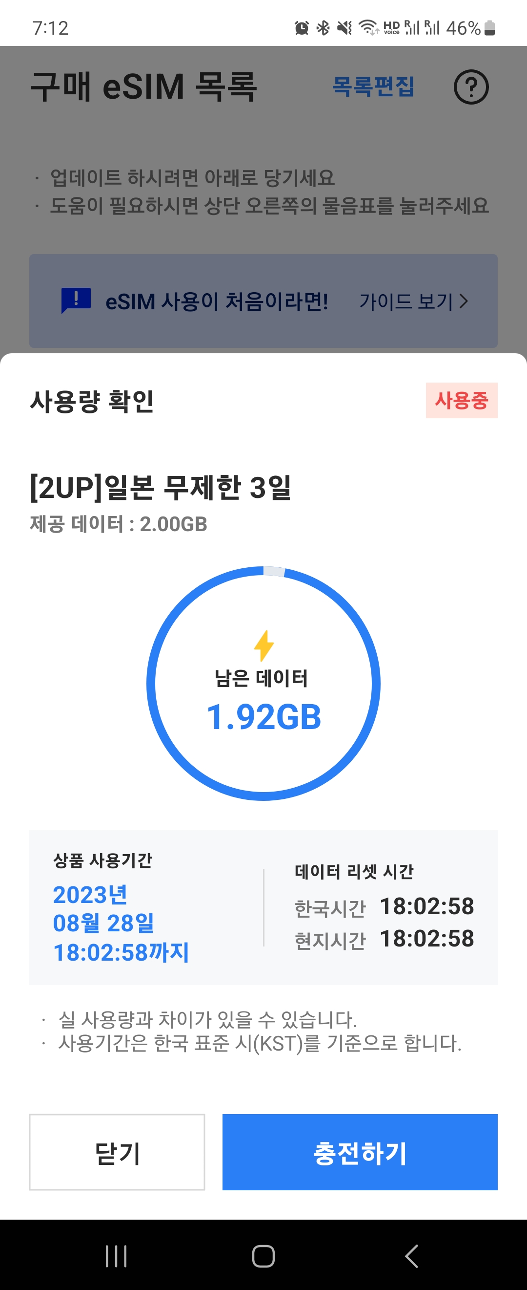 여행 중간중간에 인스타도 하고, 카톡도 보내고, 구글맵도 보고, 인터넷 검색도 하고 했었는데 하루에 1GB 쓰는것도 쉽지 않더라고요. 조금 아껴쓰시는분들이라면 하루 1GB 정도로도 충분해보이고요. 유튜브는 안봤지만, 유튜브도 종종 시청하고 하는분들은 넉넉하게 2GB로 잡으시면 적당할 것 같아요. 인스타나 카톡, 인스타 업로드, 카톡 사진전송, 구글맵 검색, 네이버 검색 등으로만 치면, 억지로 아껴쓰려고 하지 않았음에도 하루 1GB 정도 소진하는 것도 여유로웠습니다.