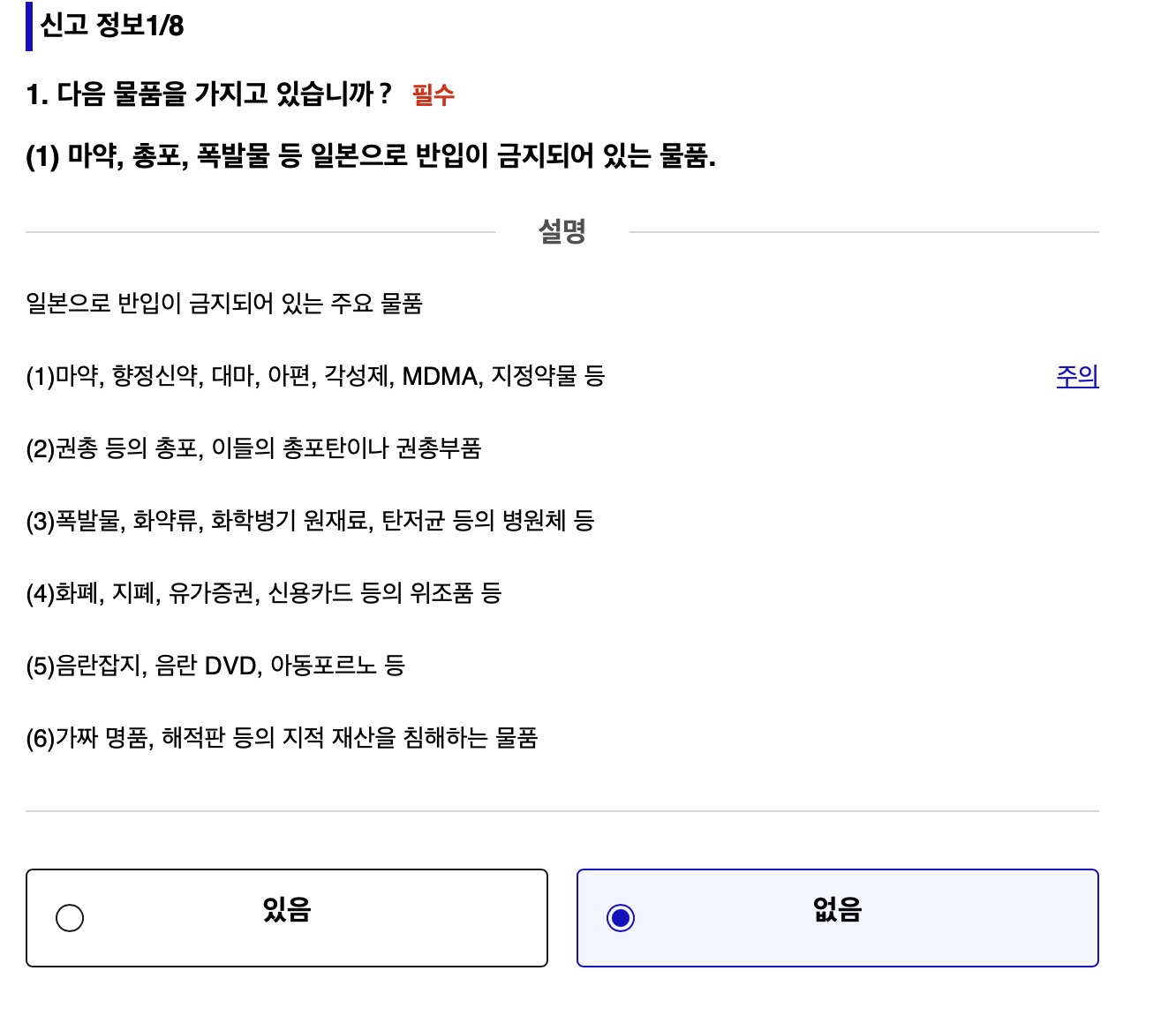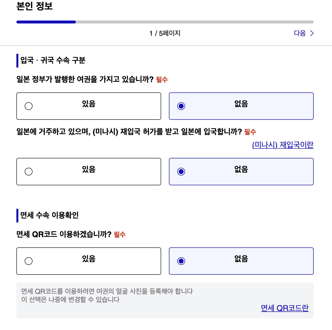 위 처럼 넣어주시고요. 저는 면세점을 이용하지 않았기 때문에 면세 수속 이용확인은 없음으로 처리했습니다.