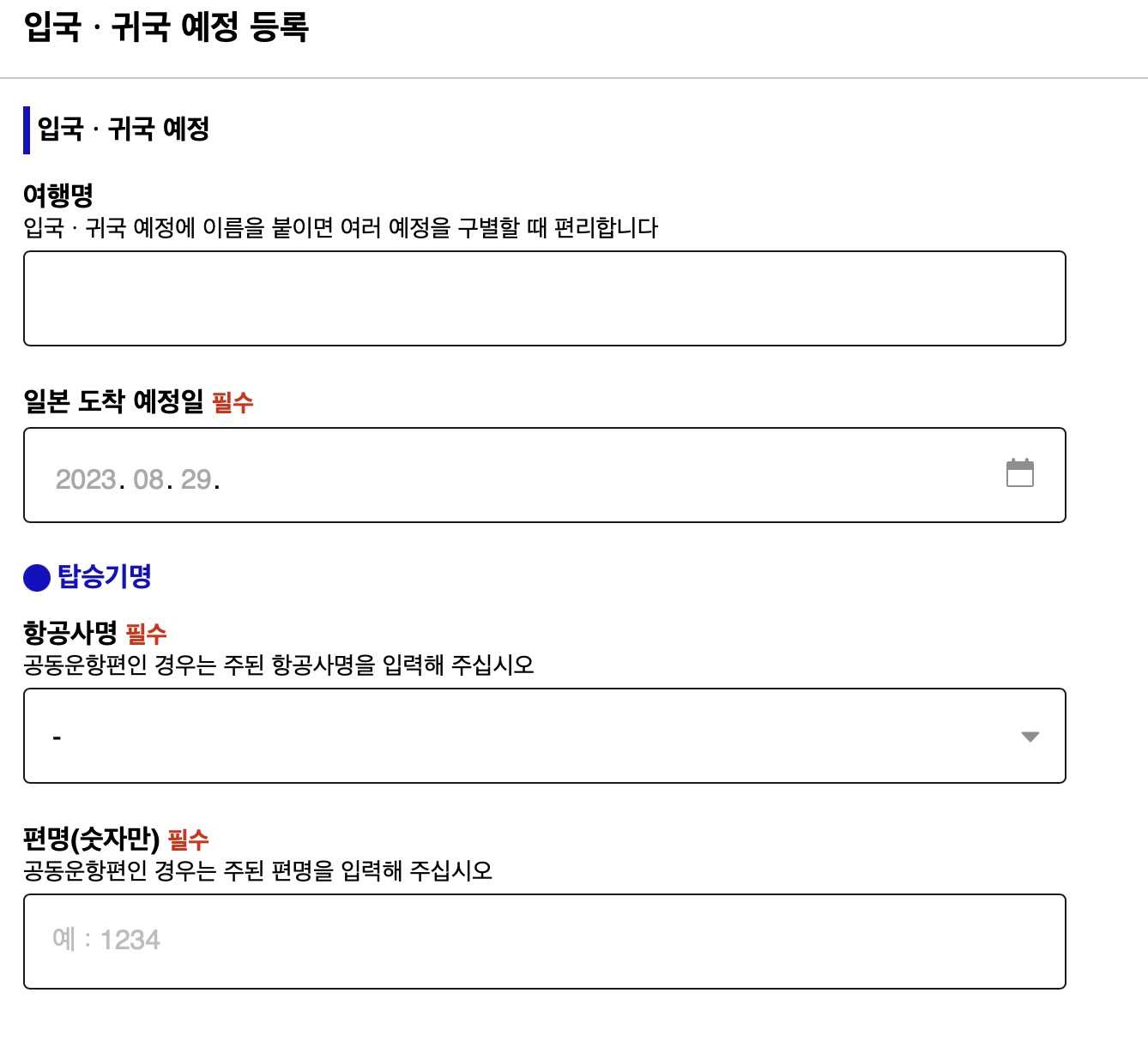 여기에서 [여행명]은 본인이 알아보기 쉽도록 그냥 아무거나 넣어주시면 되고요. 일본 도착 예정일은 말 그대로 일본에 도착하는 날짜를 기입해주세요. 아래쪽에 탑승기명이 중요한데, 항공사명과 편명을 정확하게 넣어야합니다. 바우처나 이티켓을 참고해서 넣어주세요.