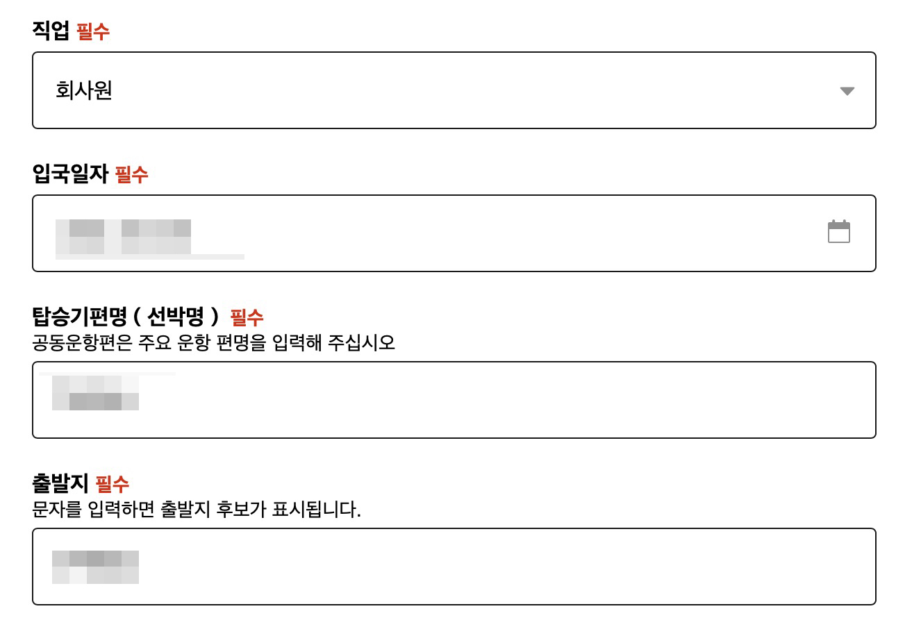 출발지 공항을 입력해주고, 탑승기편명 넣어주고 입국일자도 넣어줍니다.