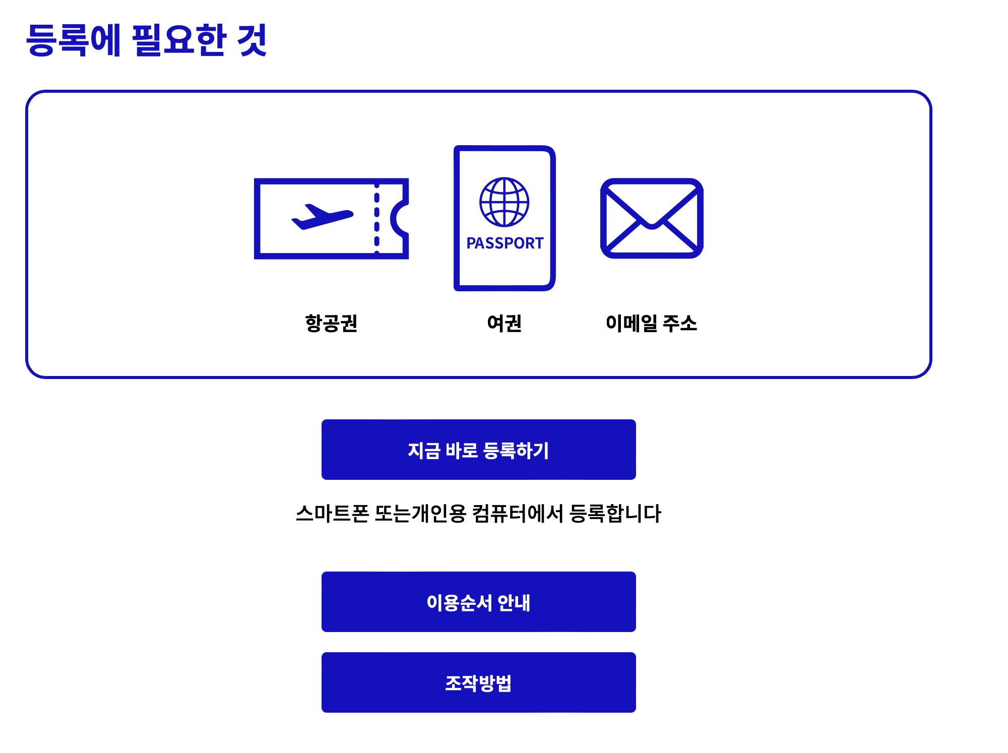 등록할 때 필요한 준비물이 있습니다. 우선 항공권 또는 이티켓이 있어야하고요. 여권도 준비해주세요. 그리고 이메일 주소가 필요합니다.