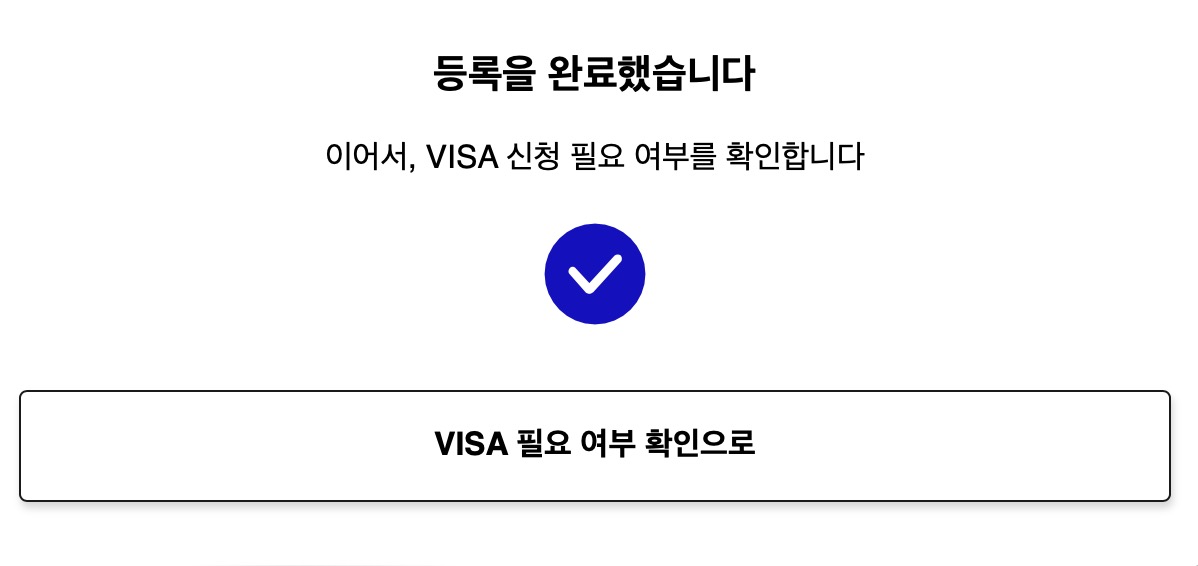 등록이 완료되면 위 그림 처럼 [등록을 완료했습니다]라는 창이 나타납니다. VISA가 필요할 경우 [아래쪽에 VISA 필요 여부 확인으로]를 클릭합니다.