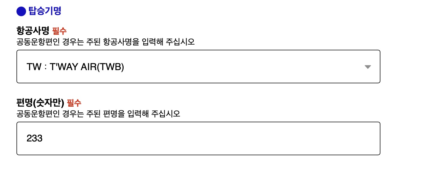 예를들어서, 티웨이 항공을 이용하는데 편명이 'TW233'이라고 적혀있다면, 위 그림처럼 항공사명에 TW를 선택하고 편명에 233을 입력하면 됩니다.
