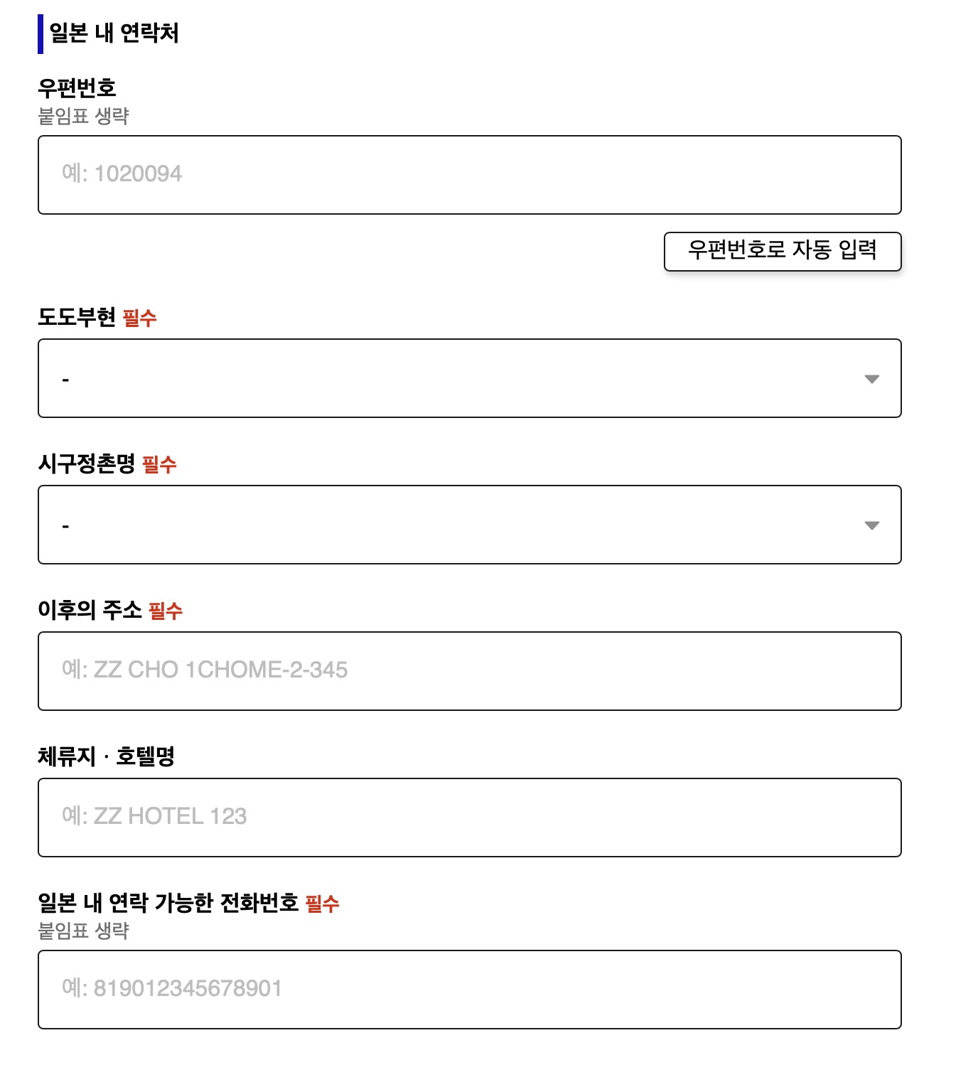 이제 일본내 연락처를 넣어주셔야해요. 비짓 재팬 웹 등록을 설명하는 다른 블로그 글들 일부에서는 여기에 아무주소나 입력하면 된다는 이야기도 있는데, 저는 개인적으로 그렇게 하지 않는쪽이 좋다고 보고요. 어떤 문제가 생길지 알 수 없는 해외여행에서는 가능하면 위험도를 줄이는게 좋다고 생각하고 있어서, 이 부분은 정확하게 자신이 묵을 숙소 주소를 넣어주시는게 좋을 것 같아요.