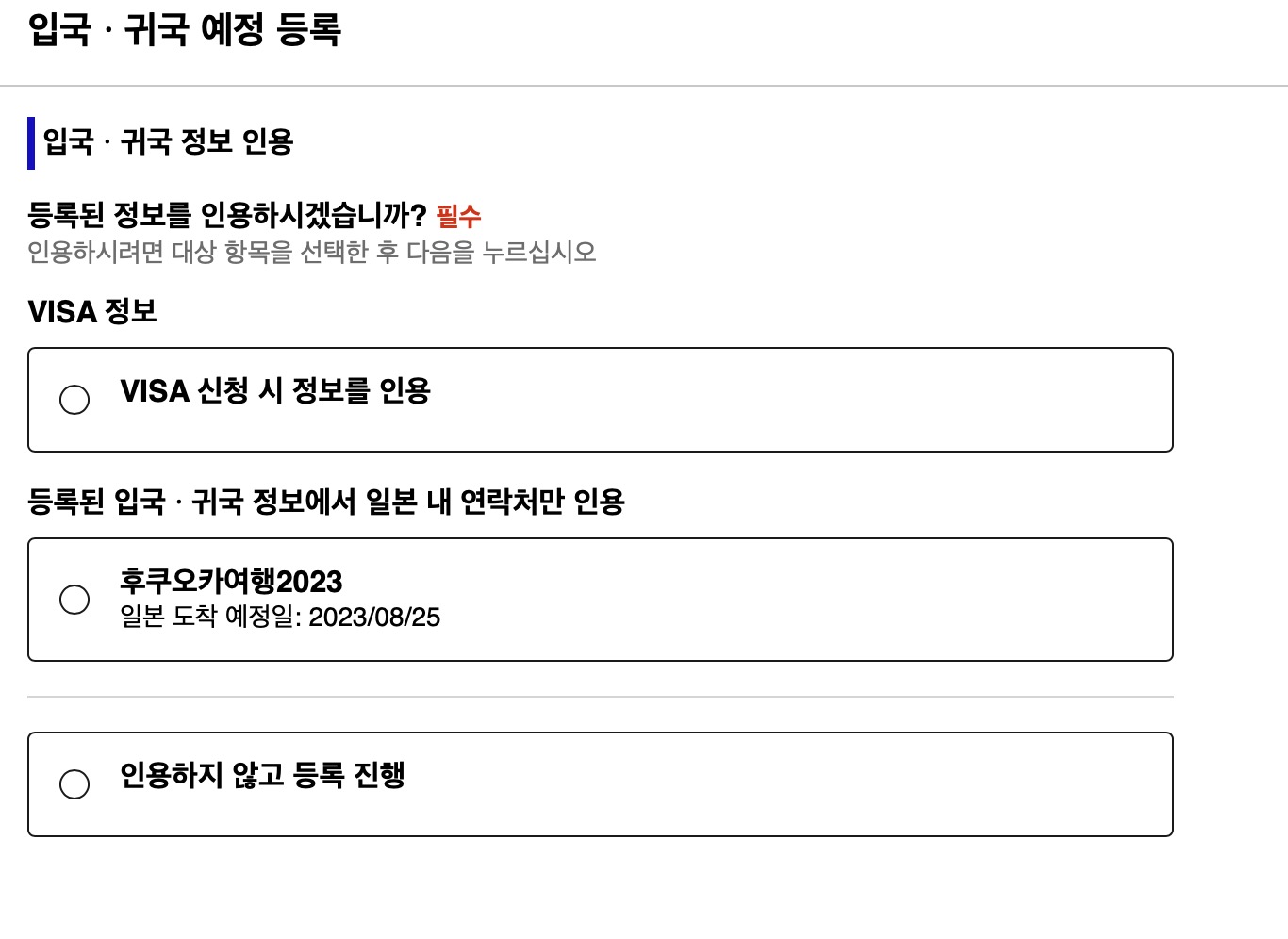 저는 지금 입국 귀국 일정을 한 번 등록했던 적이 있어서 위 그림처럼 나오는데, 처음일 경우 등록된 입국 귀국 정보는 없는 화면이 나타납니다.