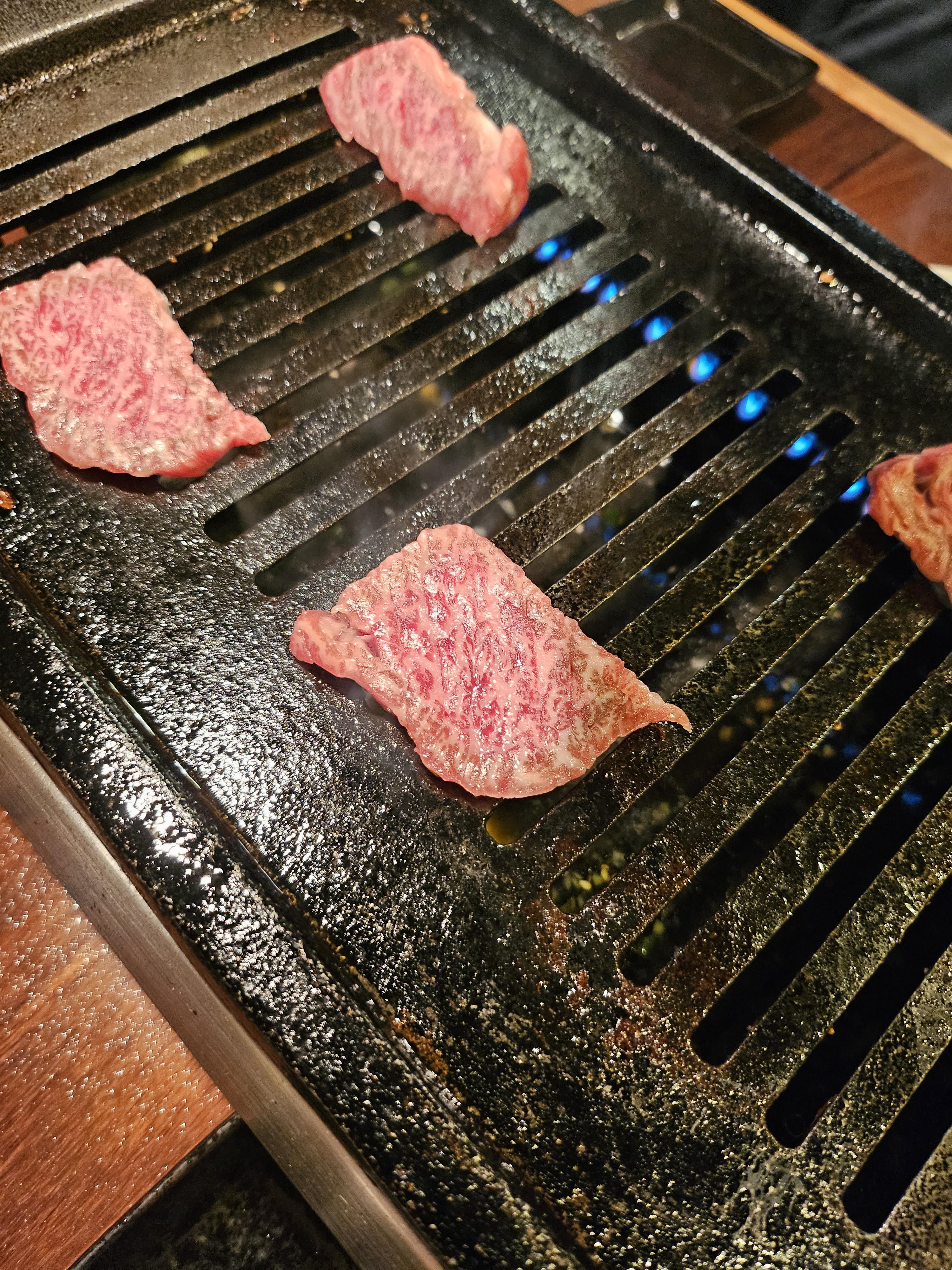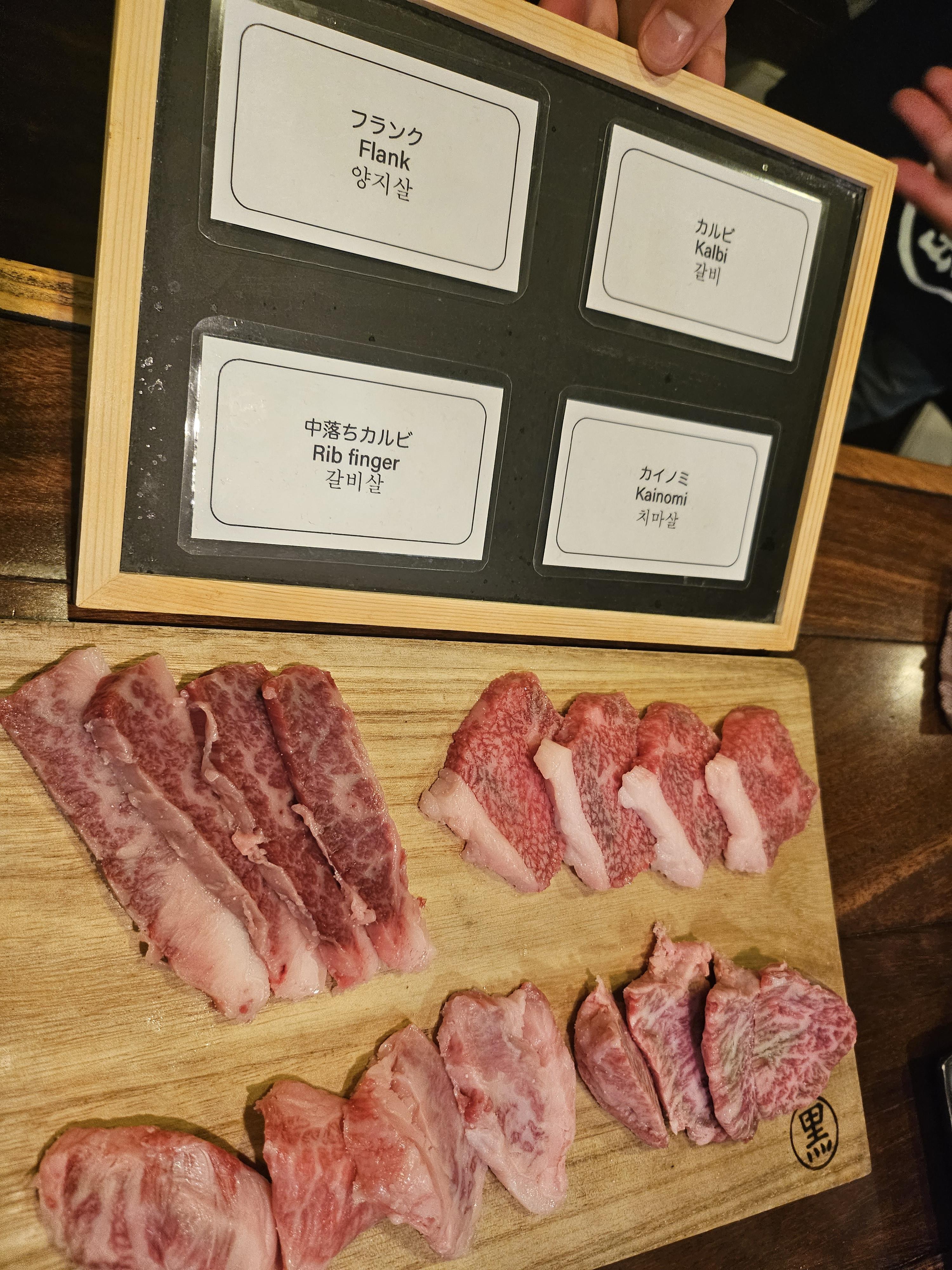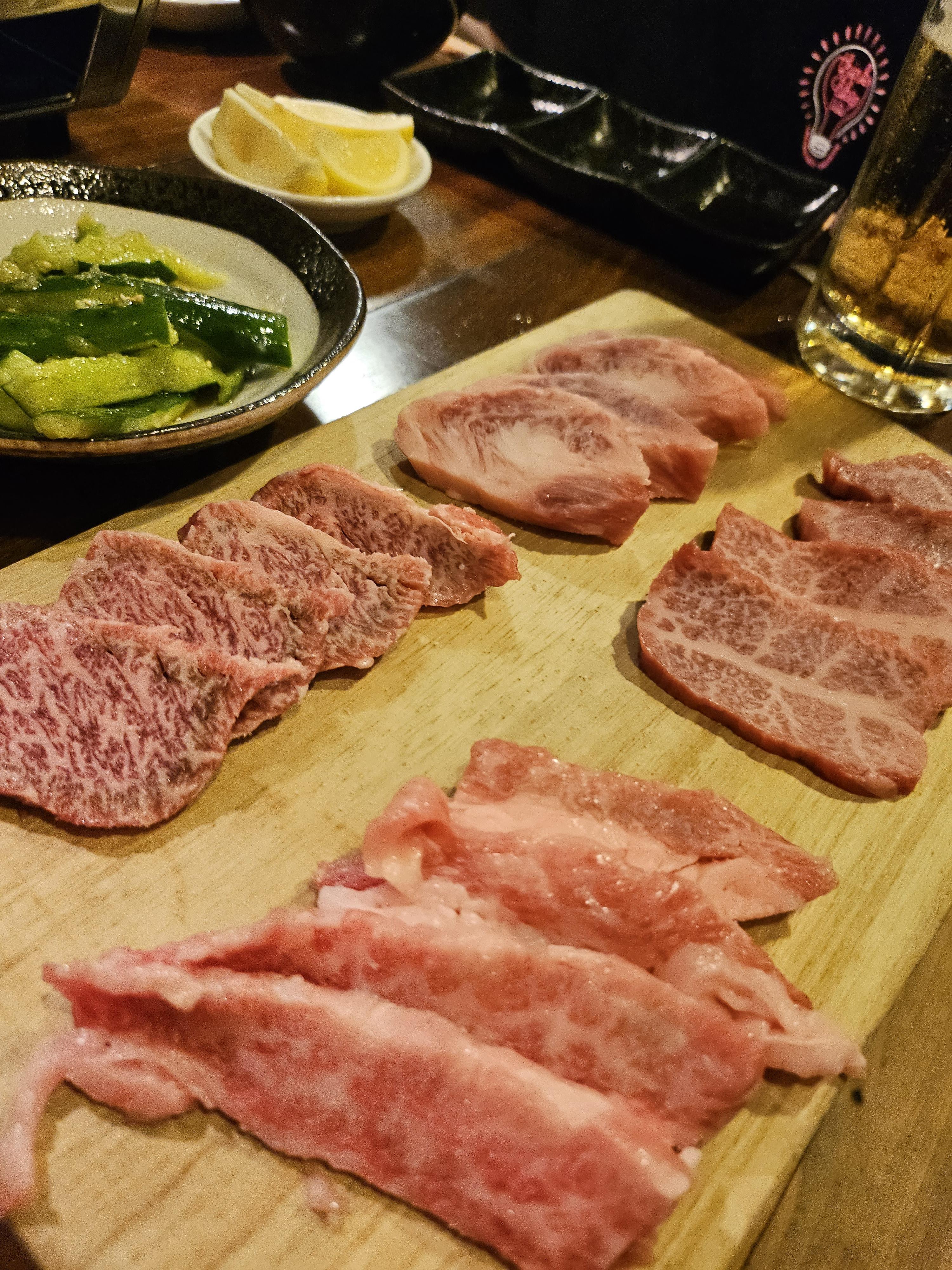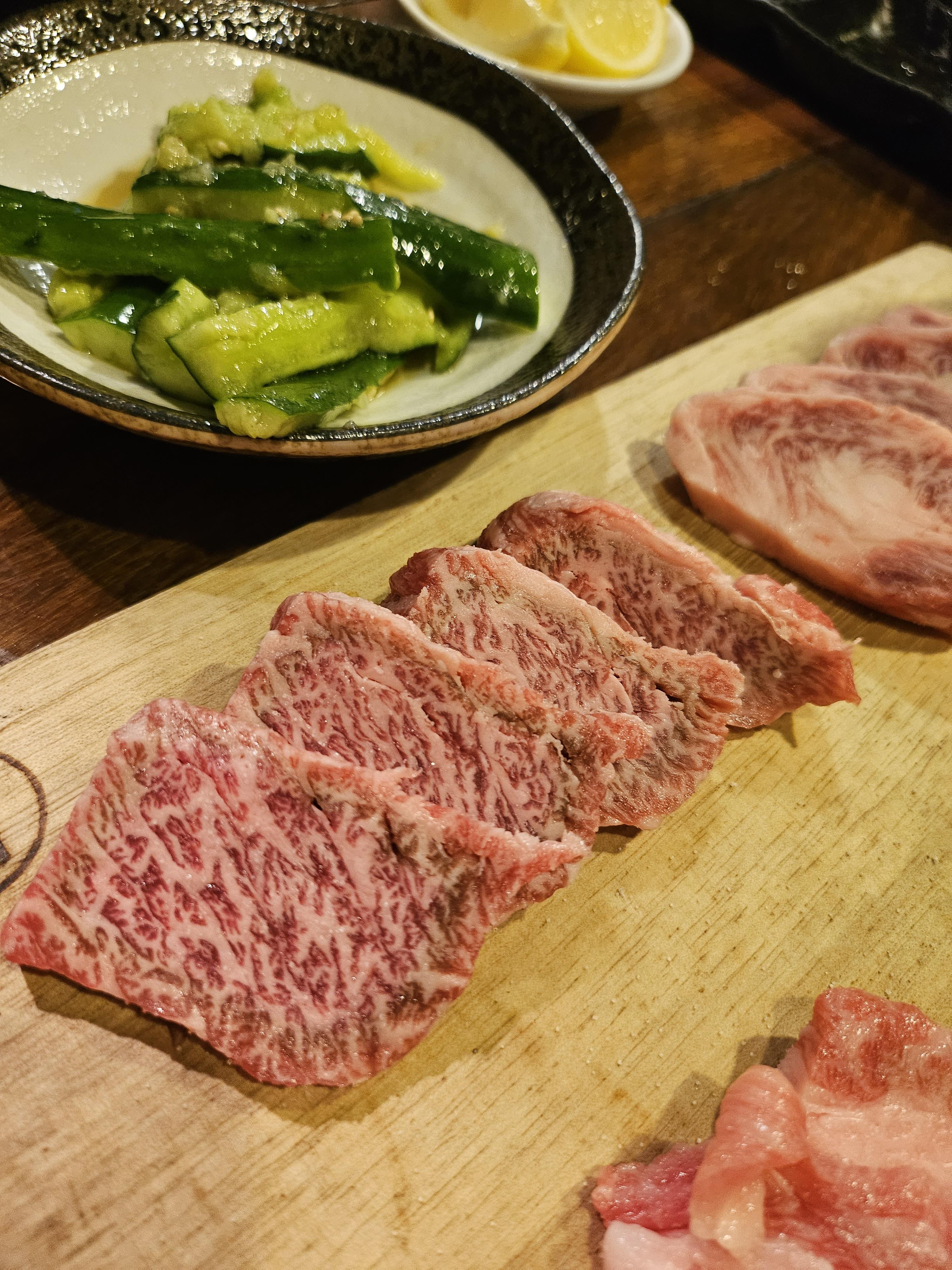 여러가지 메뉴가 있고, 구글맵 후기에서 오이무침 등이 맛있다고해서 몇 개 시켜보았습니다. 가장 강력 추천 메뉴이자 이곳 쿠로이와케의 시그니처는 제일 위에 있는 일본 흑우 4종 모음입니다. 쿠로게와규라고 돼 있는데 진짜 맛있고 가성비가 미쳤습니다 ㅎㅎ