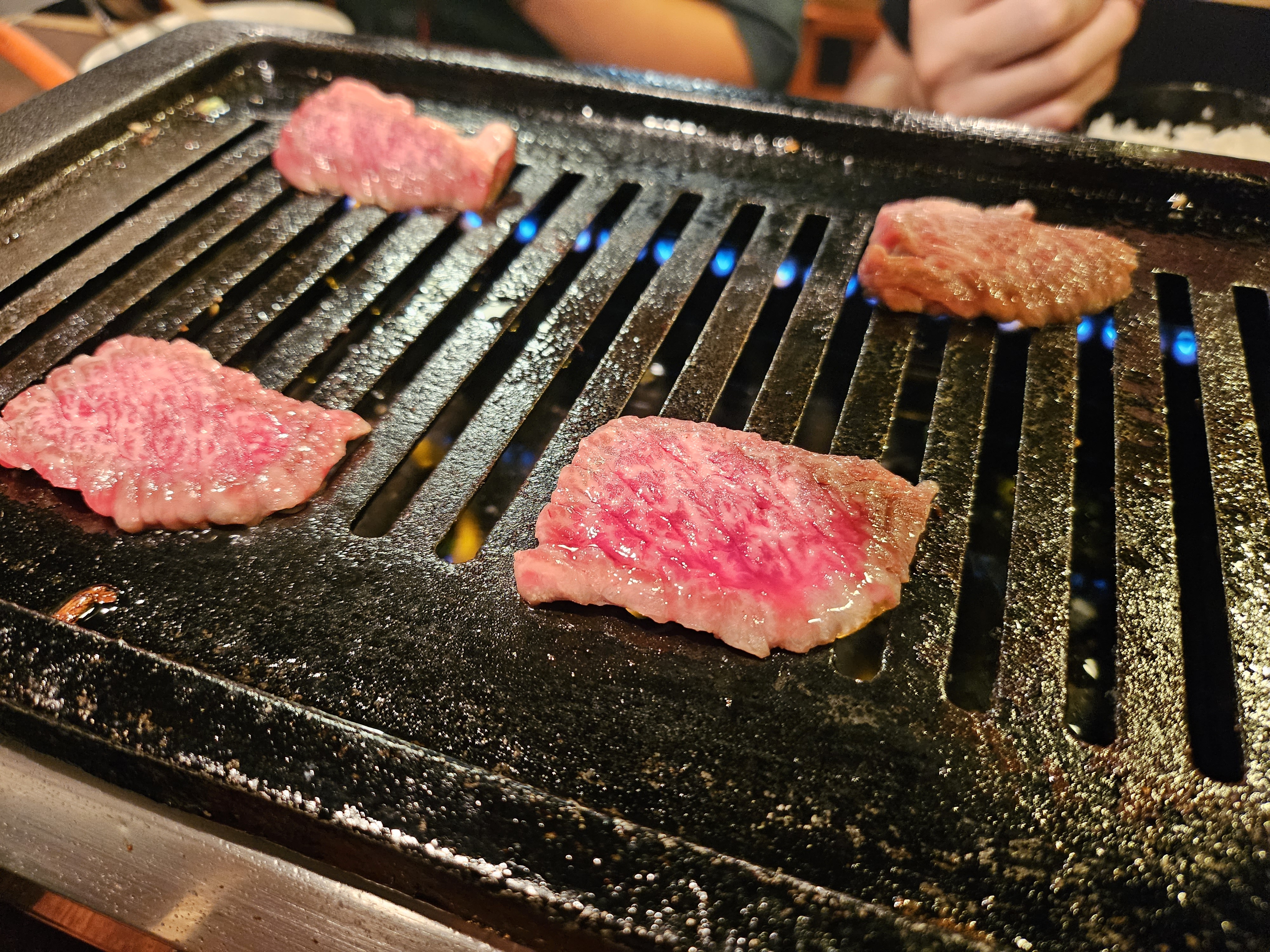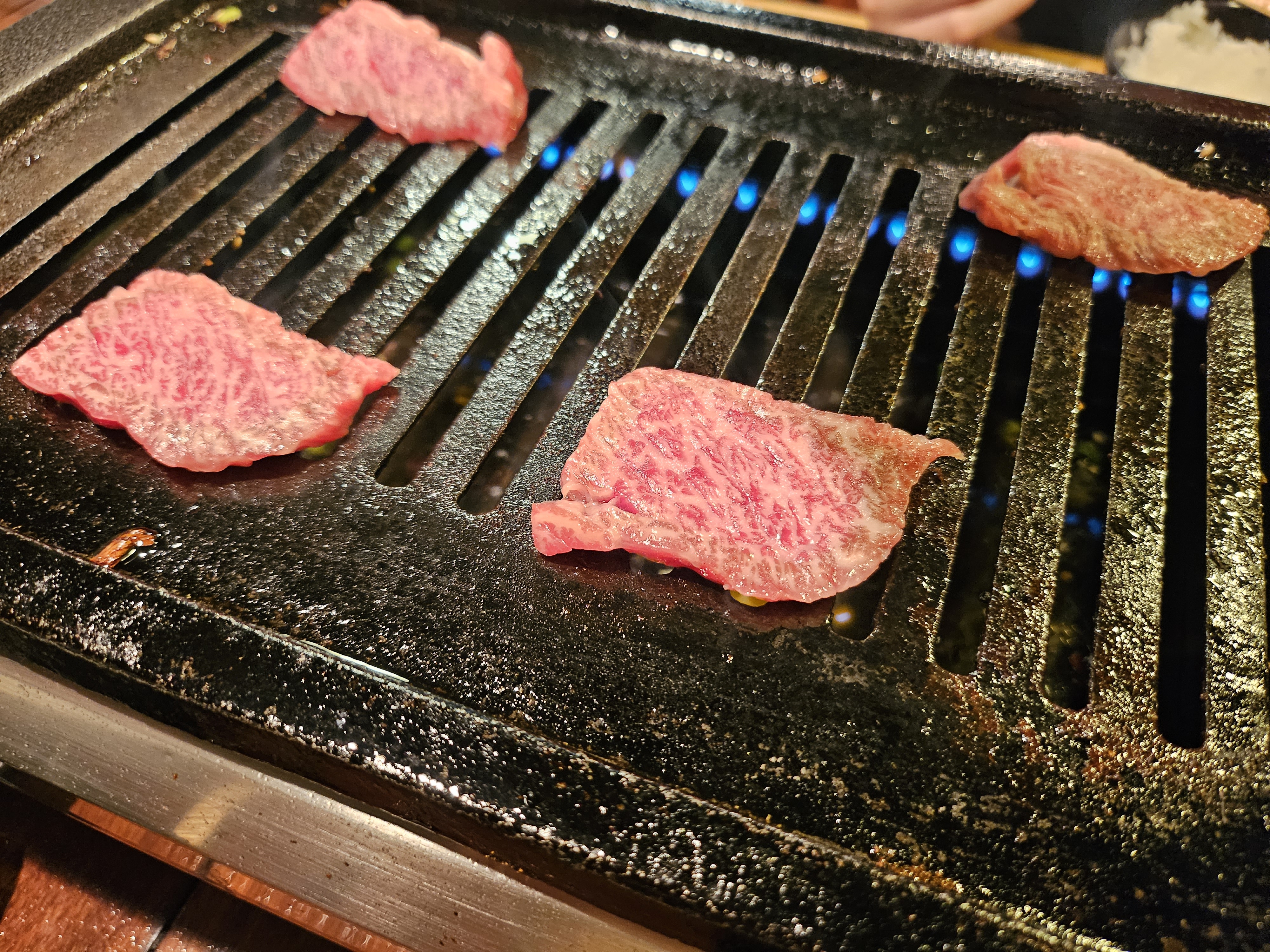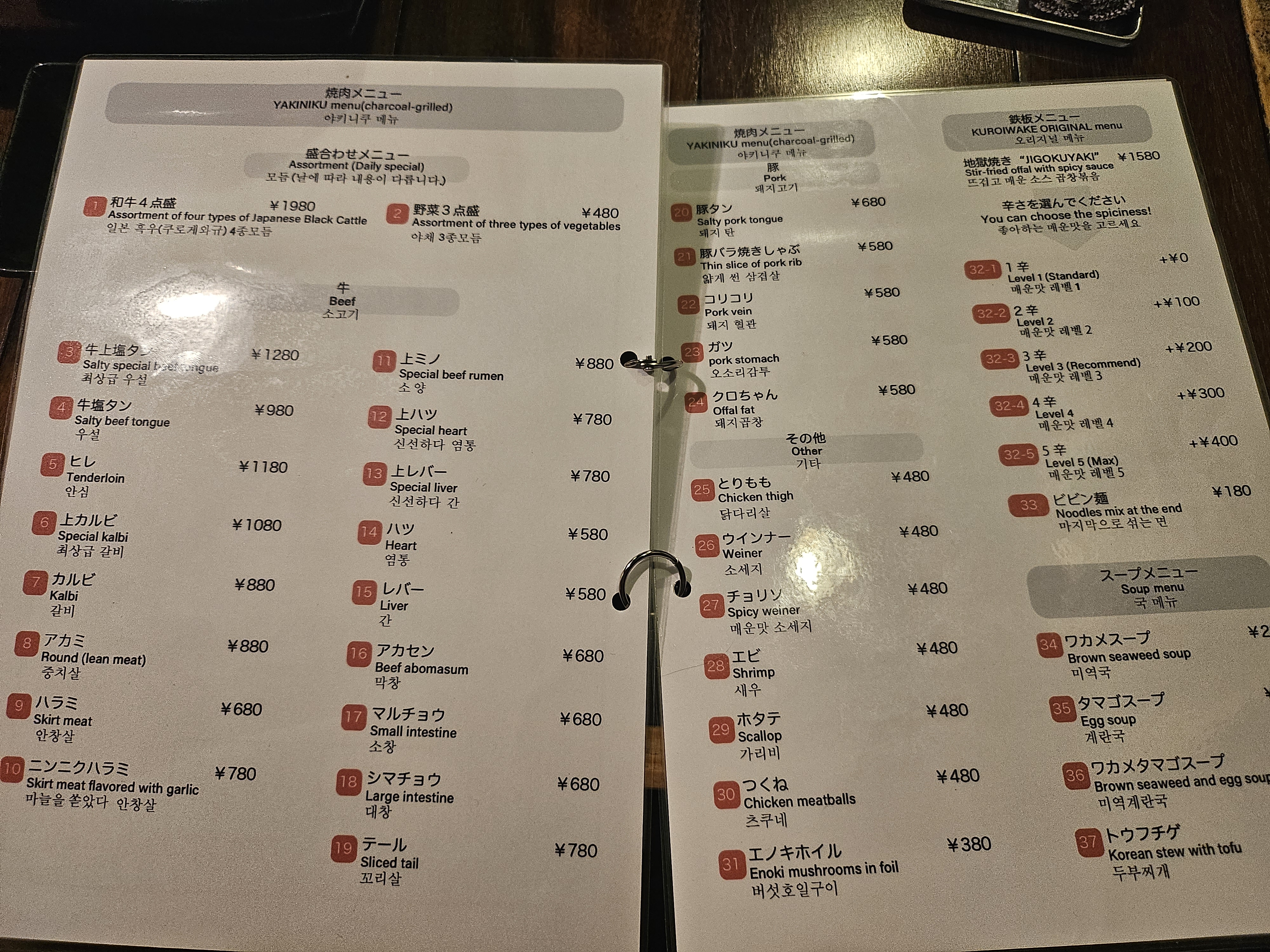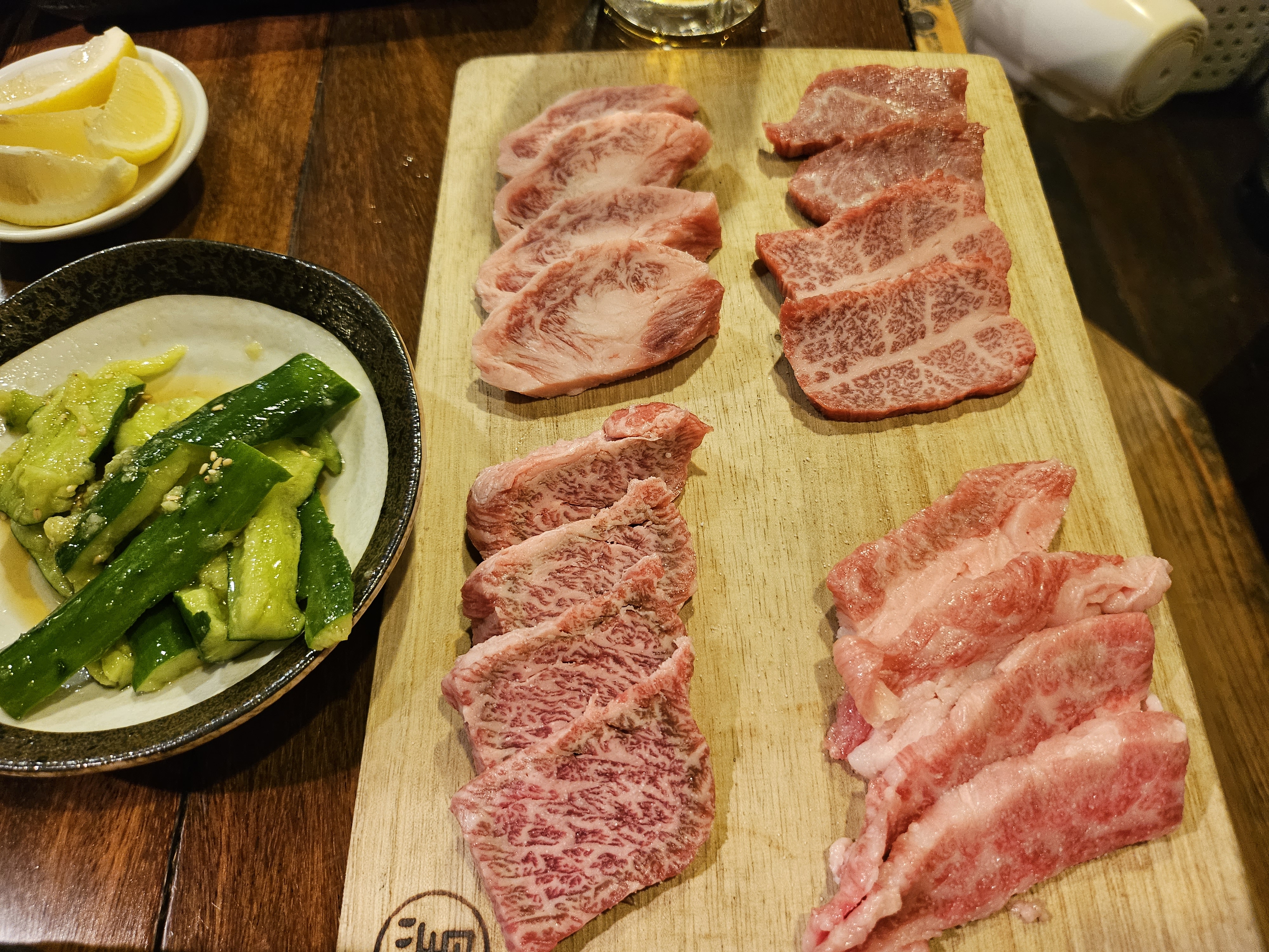 여러가지 메뉴가 있고, 구글맵 후기에서 오이무침 등이 맛있다고해서 몇 개 시켜보았습니다. 가장 강력 추천 메뉴이자 이곳 쿠로이와케의 시그니처는 제일 위에 있는 일본 흑우 4종 모음입니다. 쿠로게와규라고 돼 있는데 진짜 맛있고 가성비가 미쳤습니다 ㅎㅎ