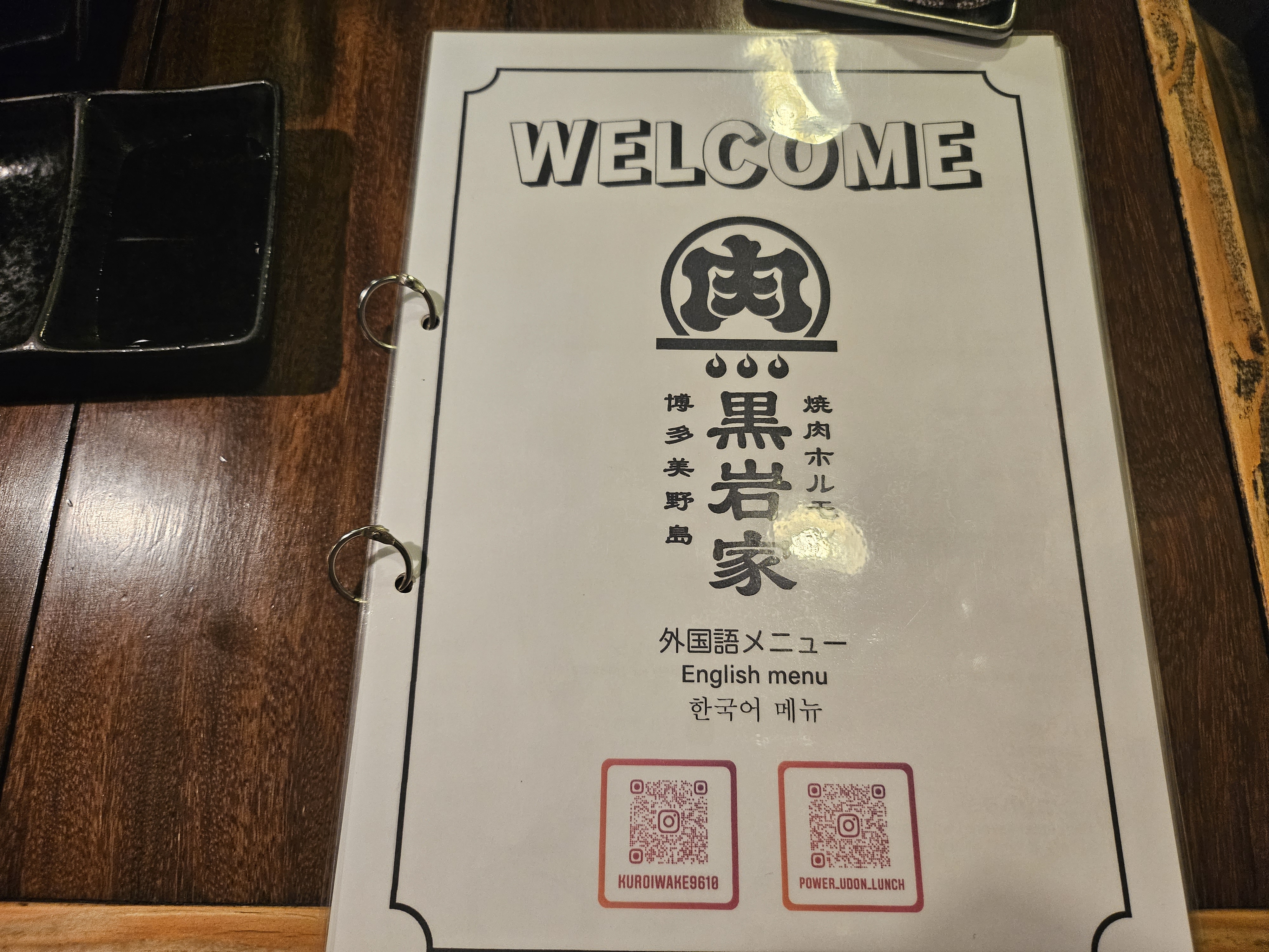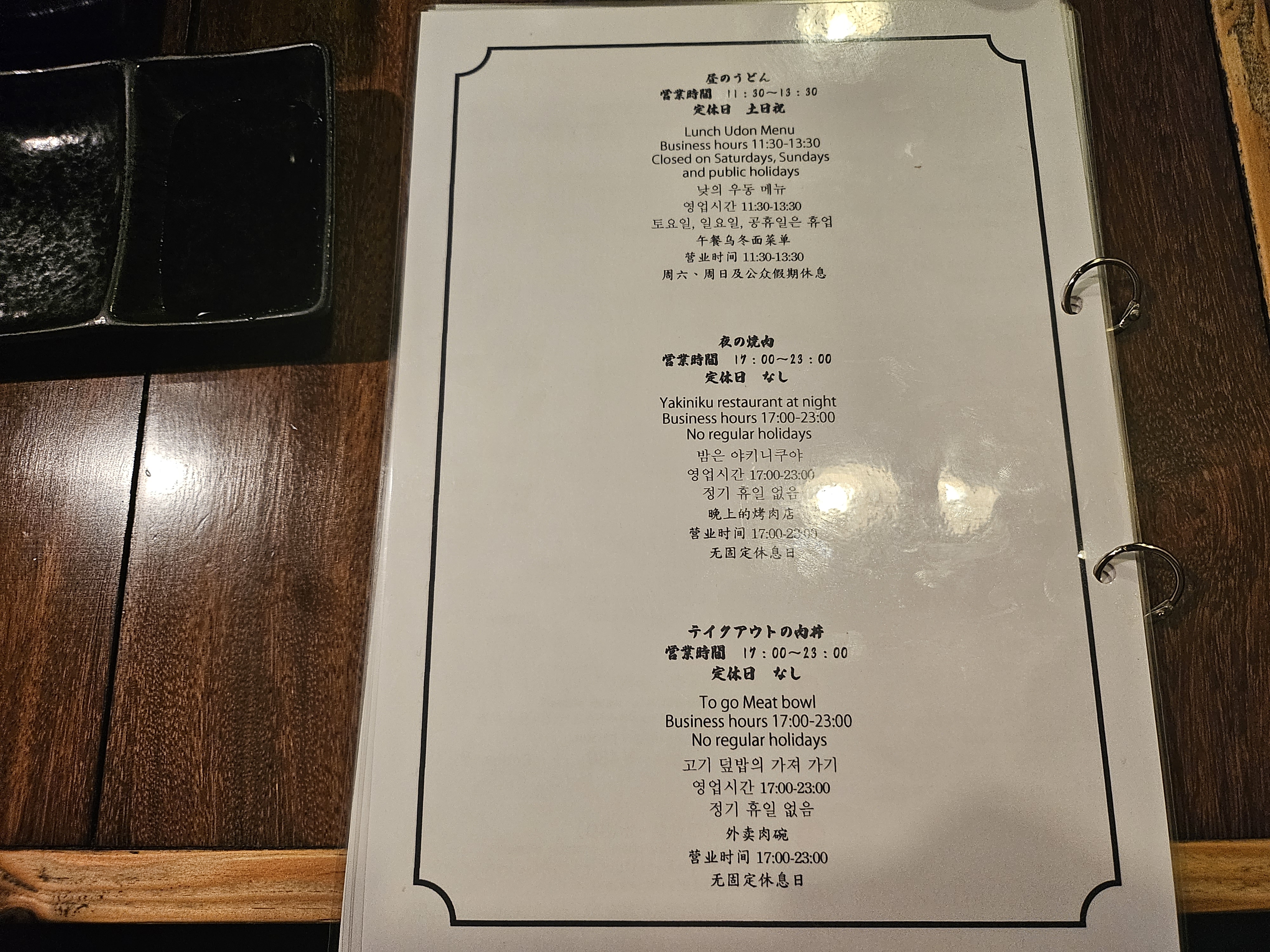 뒷면에 영업시간도 나와있는데 밤에는 11시까지 영업합니다. 휴일은 없다고 하는데요. 낮에는 우동 메뉴를 팔고, 밤에는 야키니쿠로 바뀌는 곳이고 고기덮밥 종류의 경우 테이크아웃이 가능하지만, 저희가 두 번 방문할 동안 고기덮밥 테이크아웃하시는분은 못봤습니다.