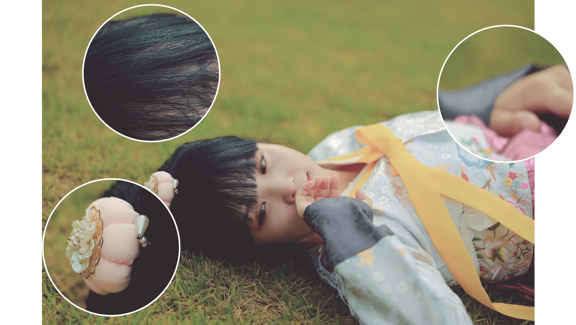 빛을 받는 환경에서는 질감표현이 선명하게 잘 되고요. 포커스 면과 떨어지는 구간에 있는 머리띠의 경우에도 배경과 분리되어서 선명하게 나타납니다.