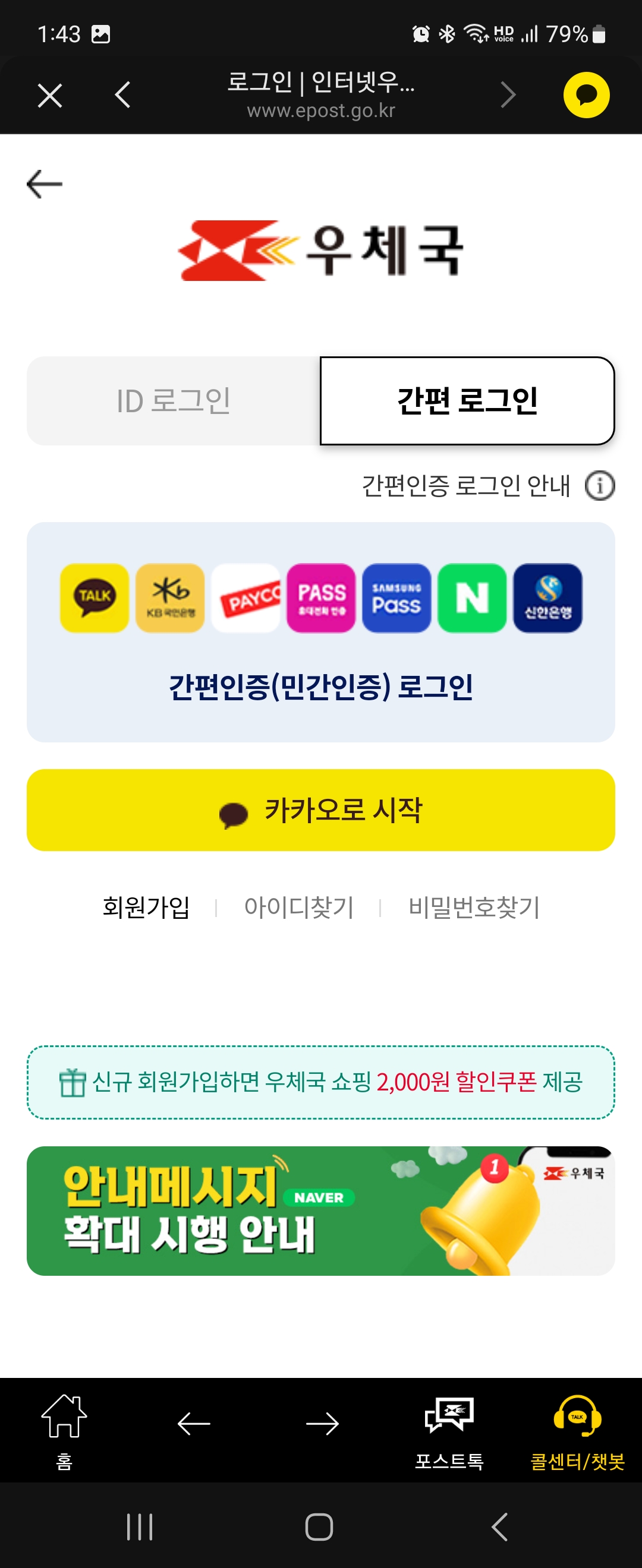 일단 모바일 카카오톡에서 영수증을 확인해봅니다. 제일 처음에 우체국 회원으로 가입을 해야하고요. 이때 [간편로그인]에서 카카오톡으로 시작하면 조금 간편하게 이용이 가능하며 인쇄를 할 컴퓨터에서도 쉽게 로그인이 가능합니다.