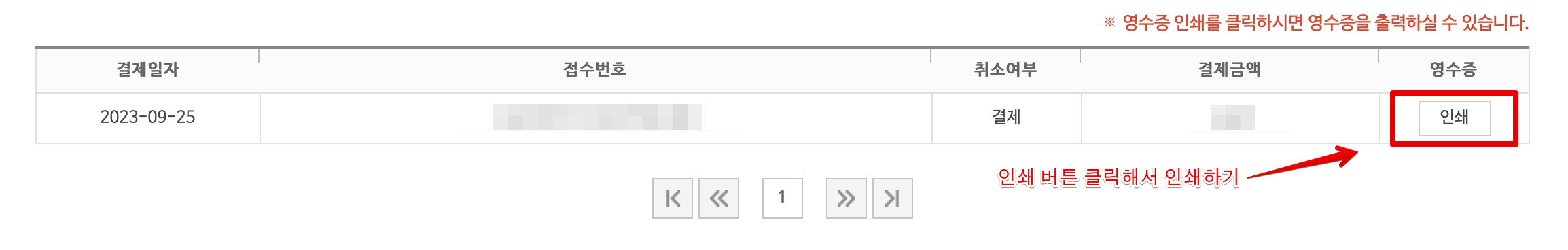 여기에서 보관해둔 영수증을 모두 확인할 수 있는데요. 출력을 원하는 영수증 제일 오른쪽 끝에 있는 [인쇄]버튼을 클릭해서 출력해주면 됩니다.