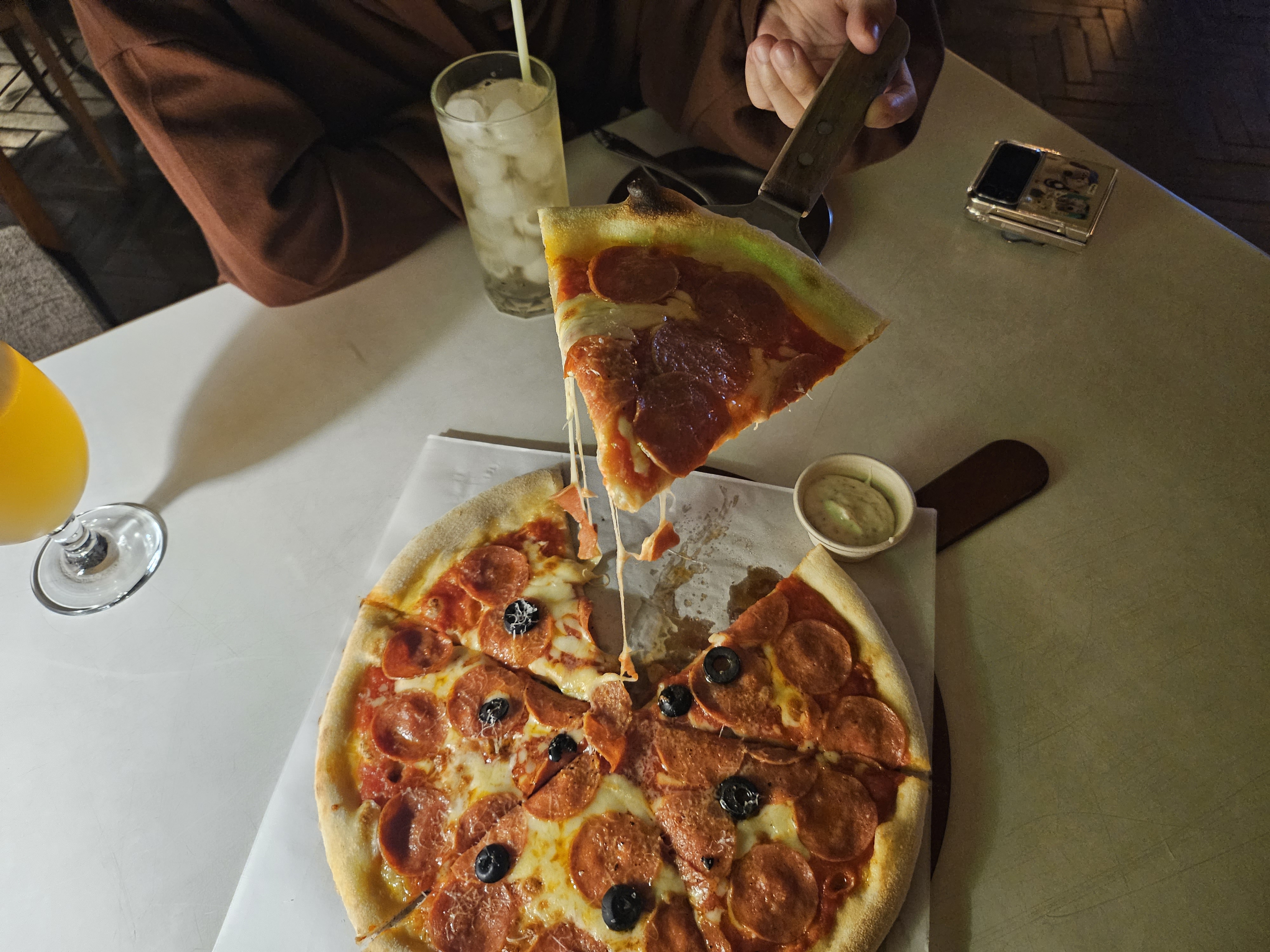 다양한 메뉴들이 있었는데 제일 메인이 피자처럼 보여서 페퍼로니 피자로 주문해보았습니다. 각 테이블마다 주문 패드가 있어서 비대면 형식으로 주문할 수 있어서 간편해서 좋았고요. 피자 퀄리티도 상당히 맛있는 편이라서 만족스러웠습니다.