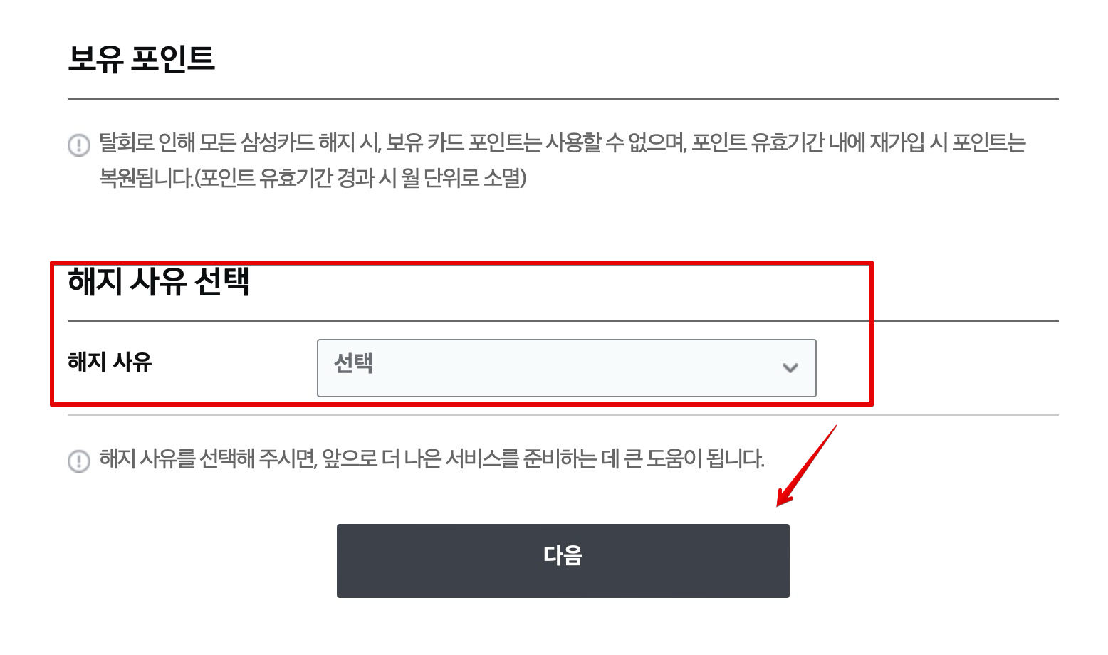 카드를 해지하게 되면 삼성카드의 포인트가 있다면 보유 포인트가 모두 소멸됩니다. 아래쪽에서 해지사유를 선택하고 [다음]을 클릭합니다.