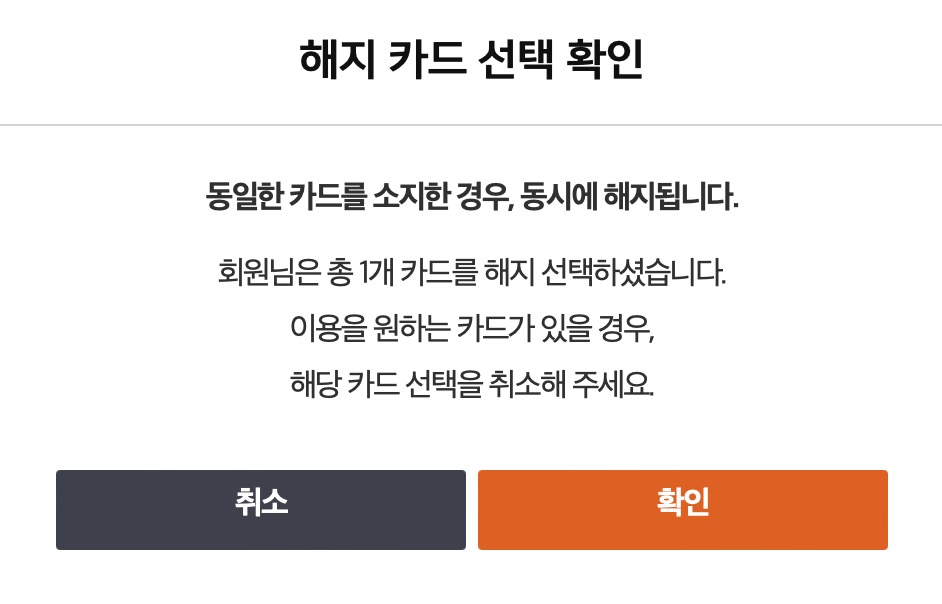 친절하게 총 1개의 카드를 해지 선택했다고 알려줍니다. [확인]을 클릭합니다.
