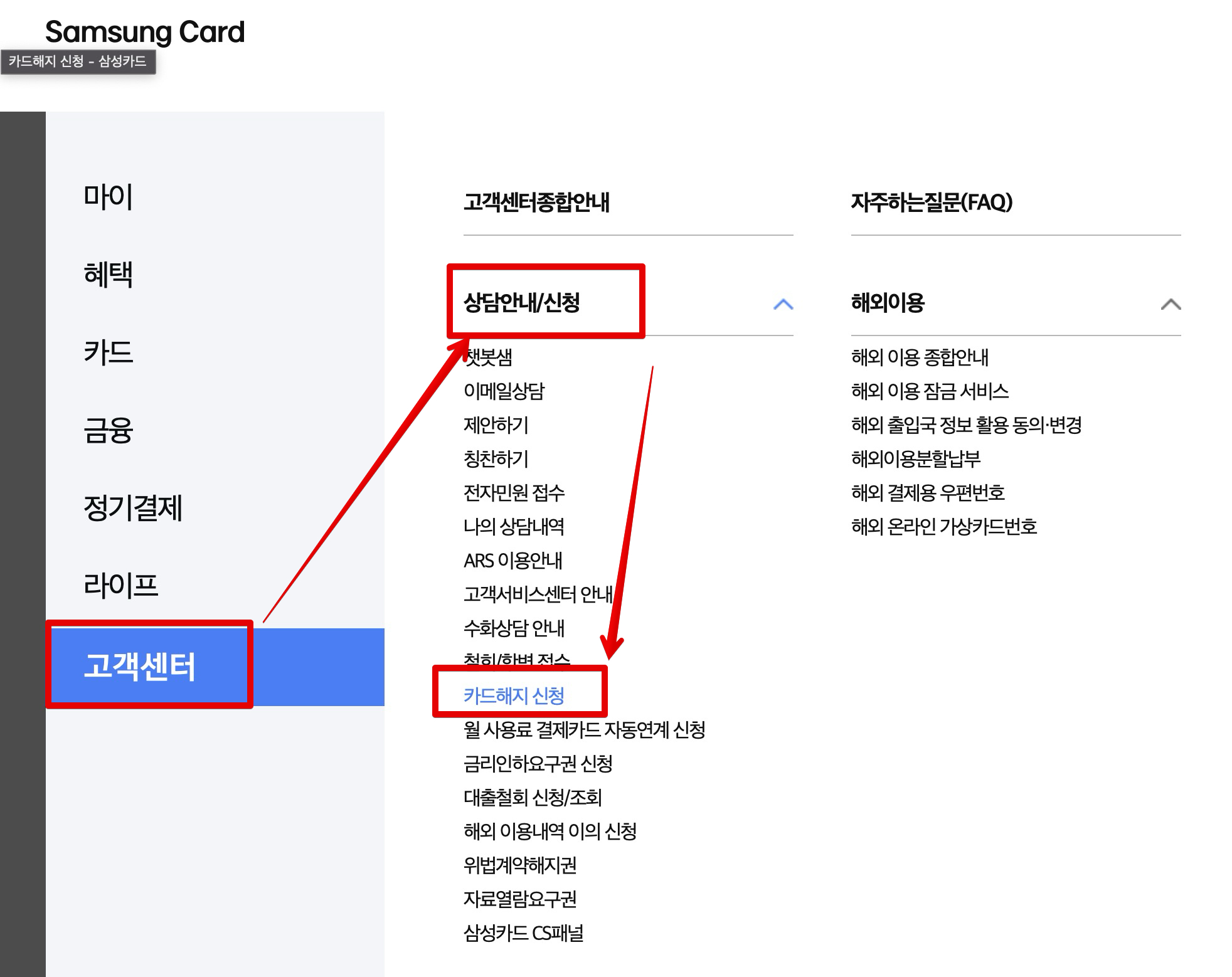 삼성카드 홈페이지에서 [고객센터] 메뉴에서 [상담안내/신청]에서 [카드해지 신청]으로 들어갑니다.
