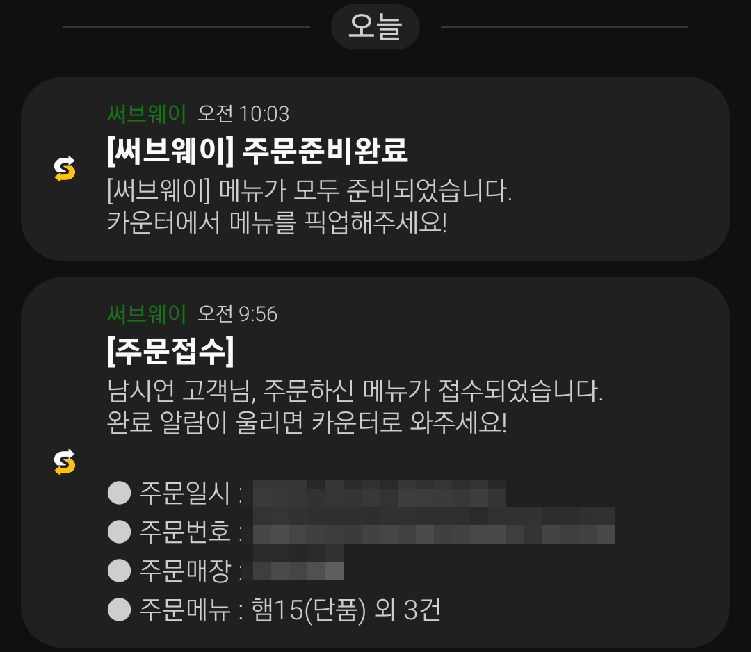 처음에 주문을 하게 되면 주문접수가 이뤄지고, 완료 알림을 준다고 합니다. 음식이 준비되면 주문준비완료 알림을 보내주고요(서브웨이 앱에서 보내줌). 이때부터 카운터로 가면 메뉴를 픽업할 수 있습니다. 미리 주문해놓고 서브웨이쪽으로 걸어가다보면 알아서 음식이 나와있어서 시간도 절약되고 참 좋은 세상이네요 ㅎㅎ