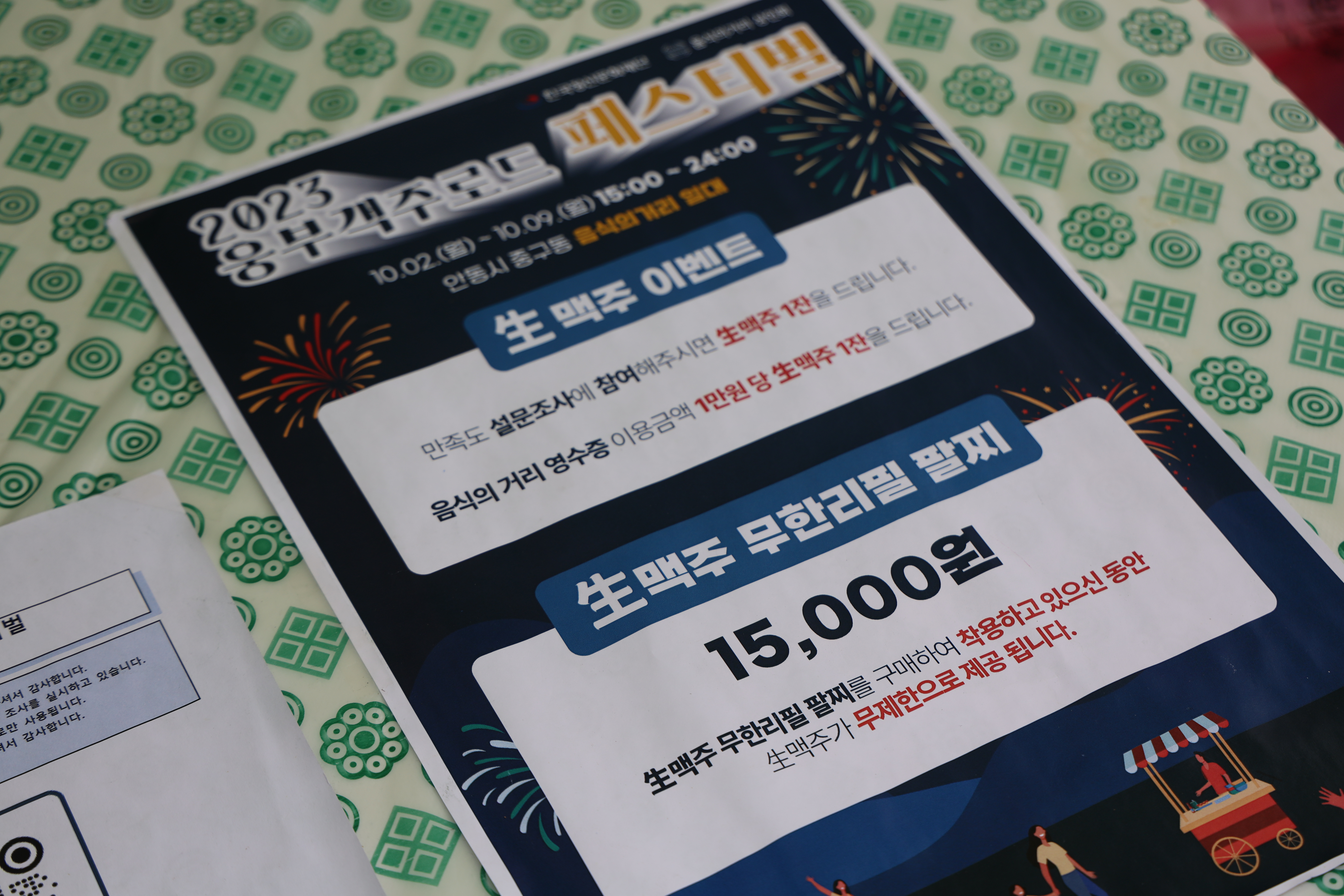 음식의거리에서는 생맥주 이벤트도 열리는데요. 2023 웅부객주로드 페스티벌이라는 이름인데 설문조사 참여시 생맥주 1잔을 받을 수 있으며 음식의 거리 영수증에서 이용금액 1만원당 또 생맥주 1잔을 받을 수 있고요. 생맥주 무한리필 팔찌도 있고, 부스별로 지정된 음식의거리 식당이 있어서 안주의 경우 해당 식당에서 주문하면 되는 시스템입니다.