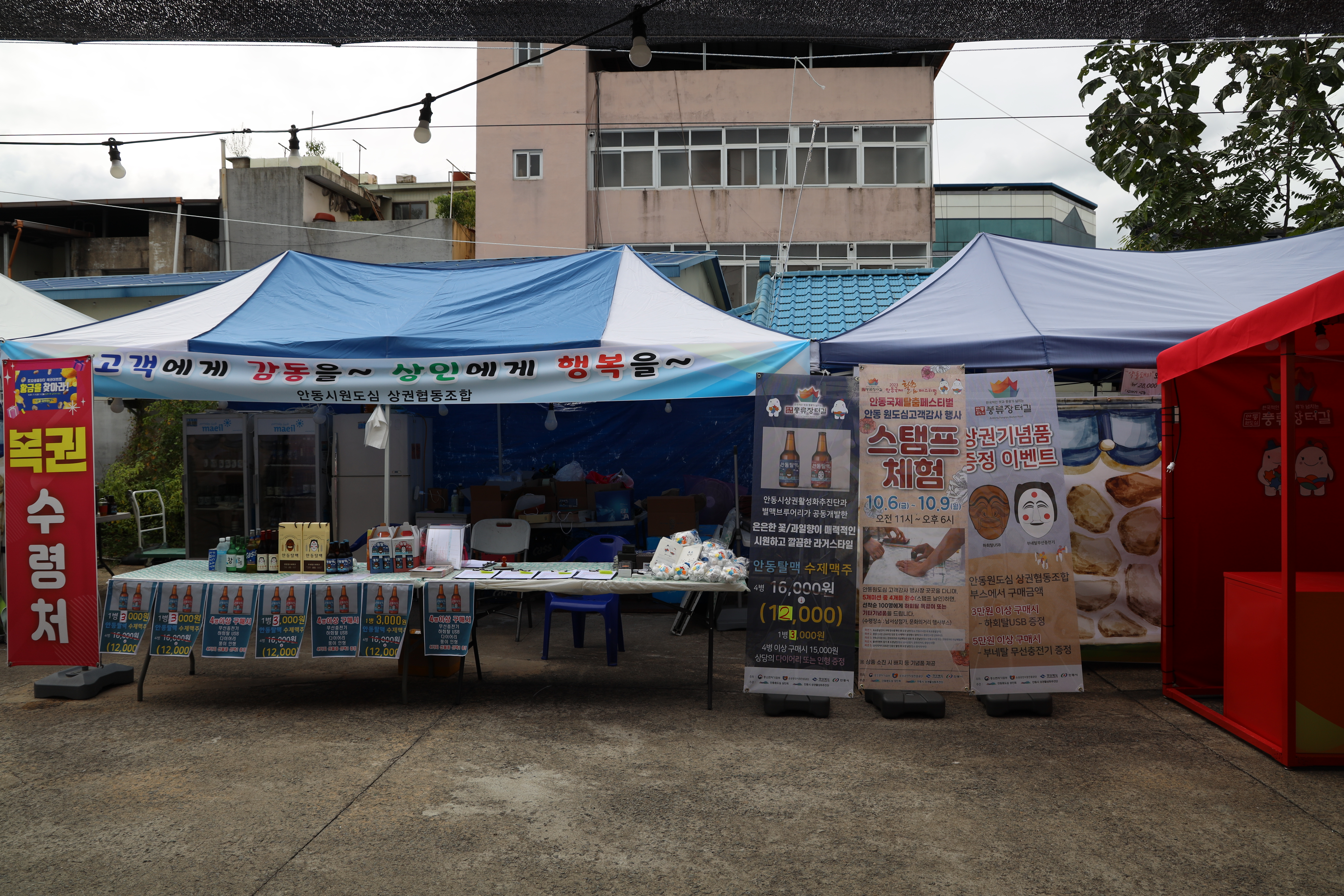 황금문어빵과 간고등어버거가 인상깊었는데요. 바로 옆에는 안동원도심 상권협동조합에서 진행하는 안동탈맥 수제맥주 시음과 판매 부스가 있었고요. 4병 이상을 구매하면 다이어리 또는 인형을 주는 이벤트도 함께 열리고 있었습니다.