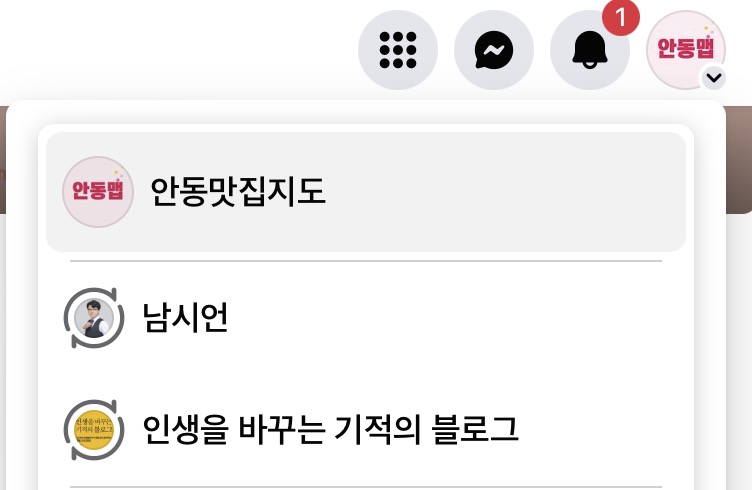 일단 제일 먼저 페이스북에 로그인 후 우측 상단에 있는 프로필 아이콘을 통해 페이스북 페이지로 로그인 전환합니다. (설정 진행은 PC에서 진행합니다)