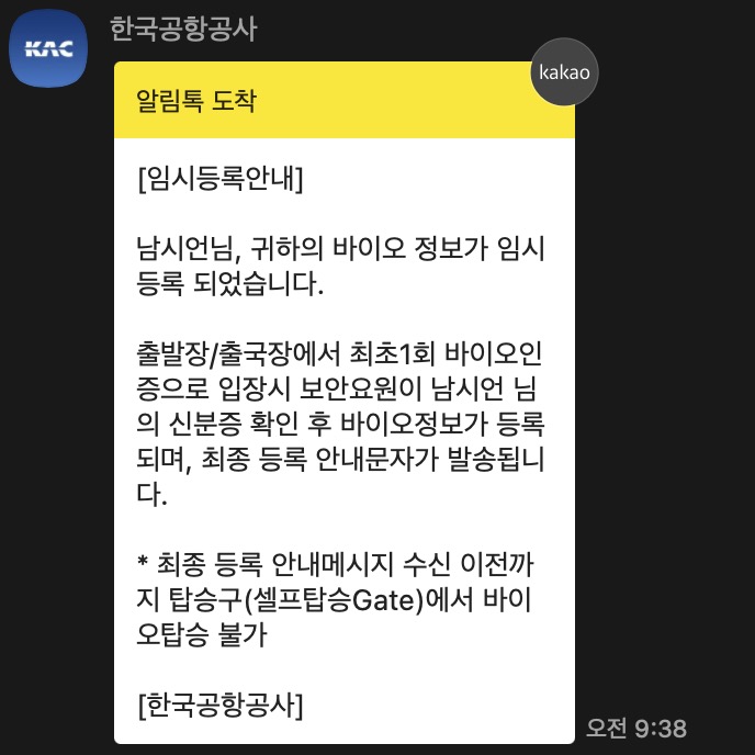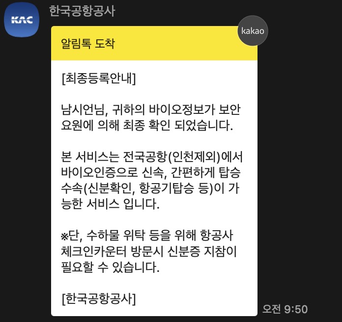 처음에 등록하게 되면, 한국공항공사로부터 이러한 카톡이 옵니다. 처음 등록시 임시등록이 되었으며 최초로 통과할 때 딱 1번 신분증을 제시해서 이름과 주민등록번호, 주소 등을 확인하는 절차가 있습니다.