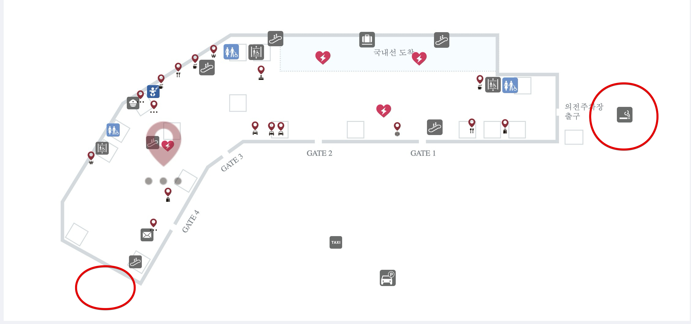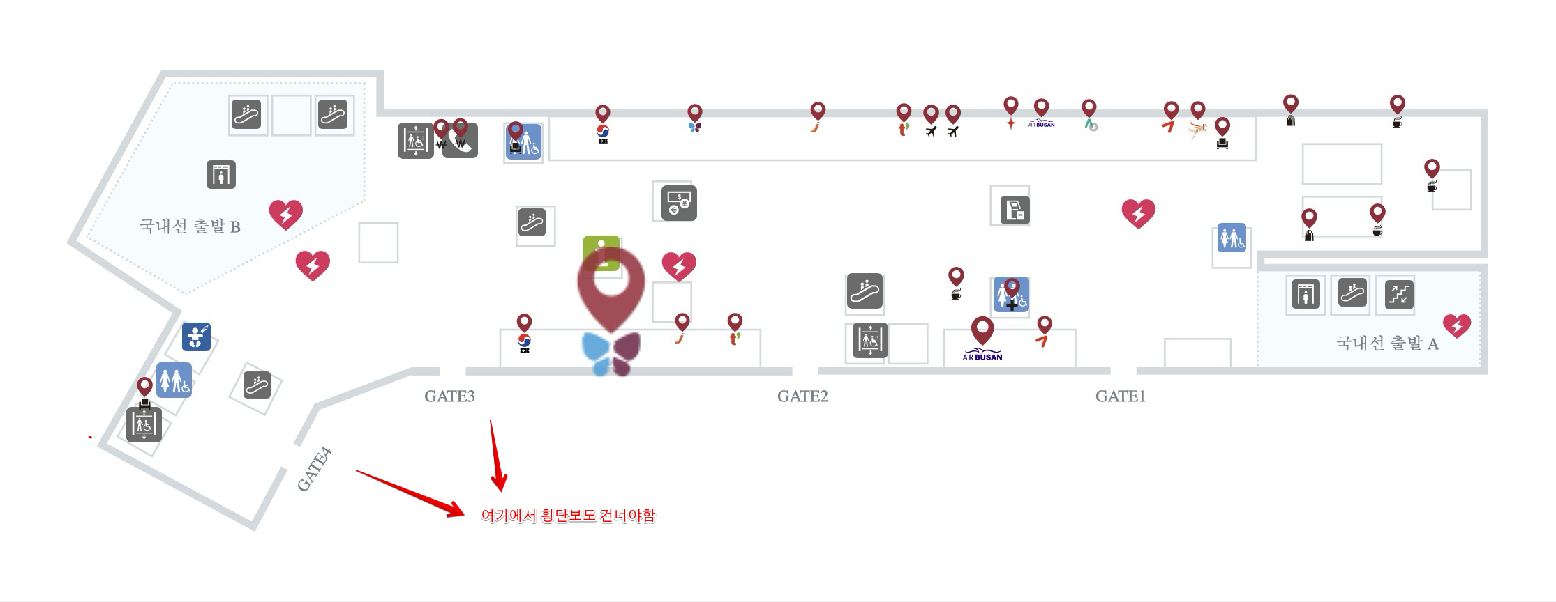 여기 외에는 흡연실로 갈 수 있는 횡단보도가 없기 때문에 반드시 게이트 3번과 4번 사이에 있는 브릿지를 통해 흡연실로 가야합니다.