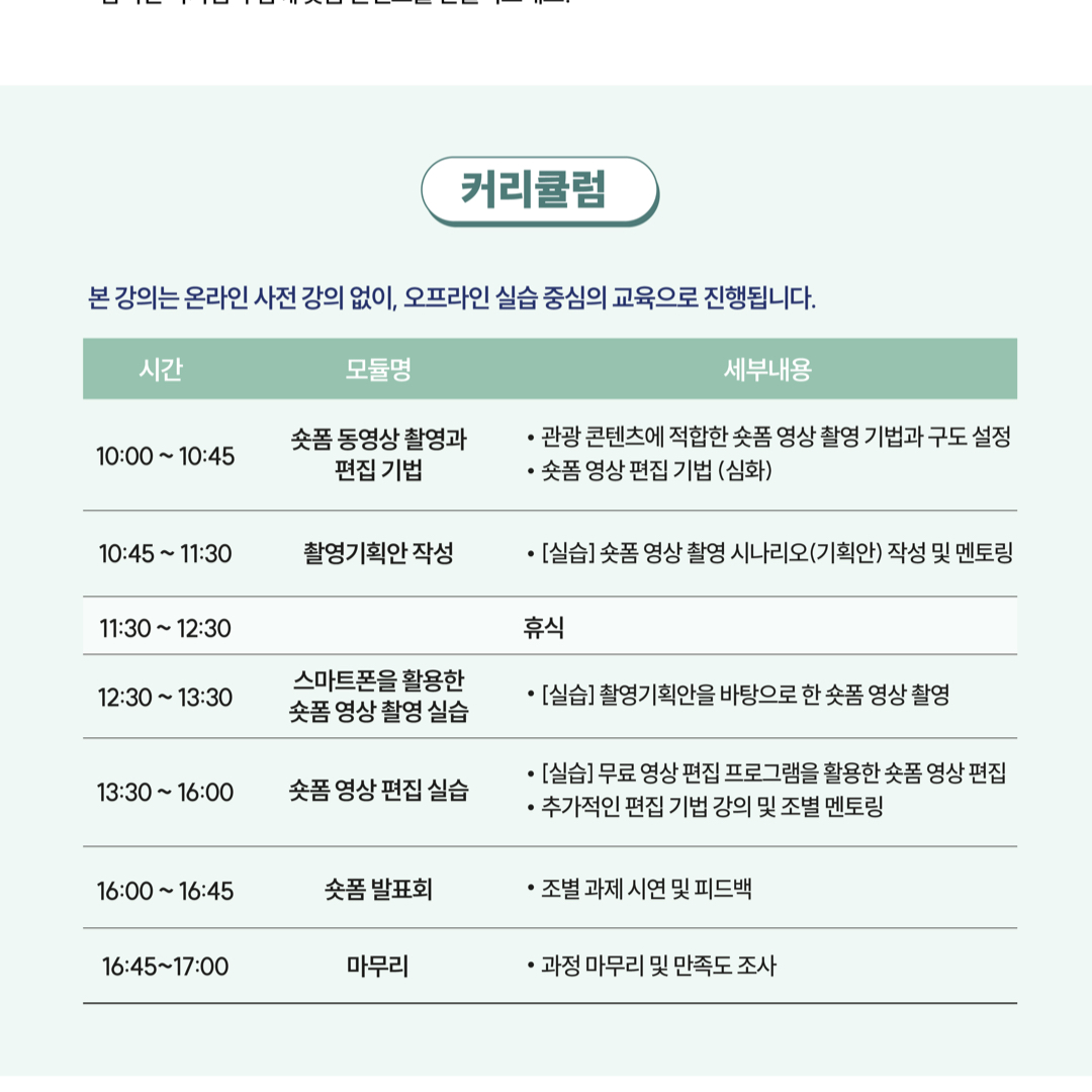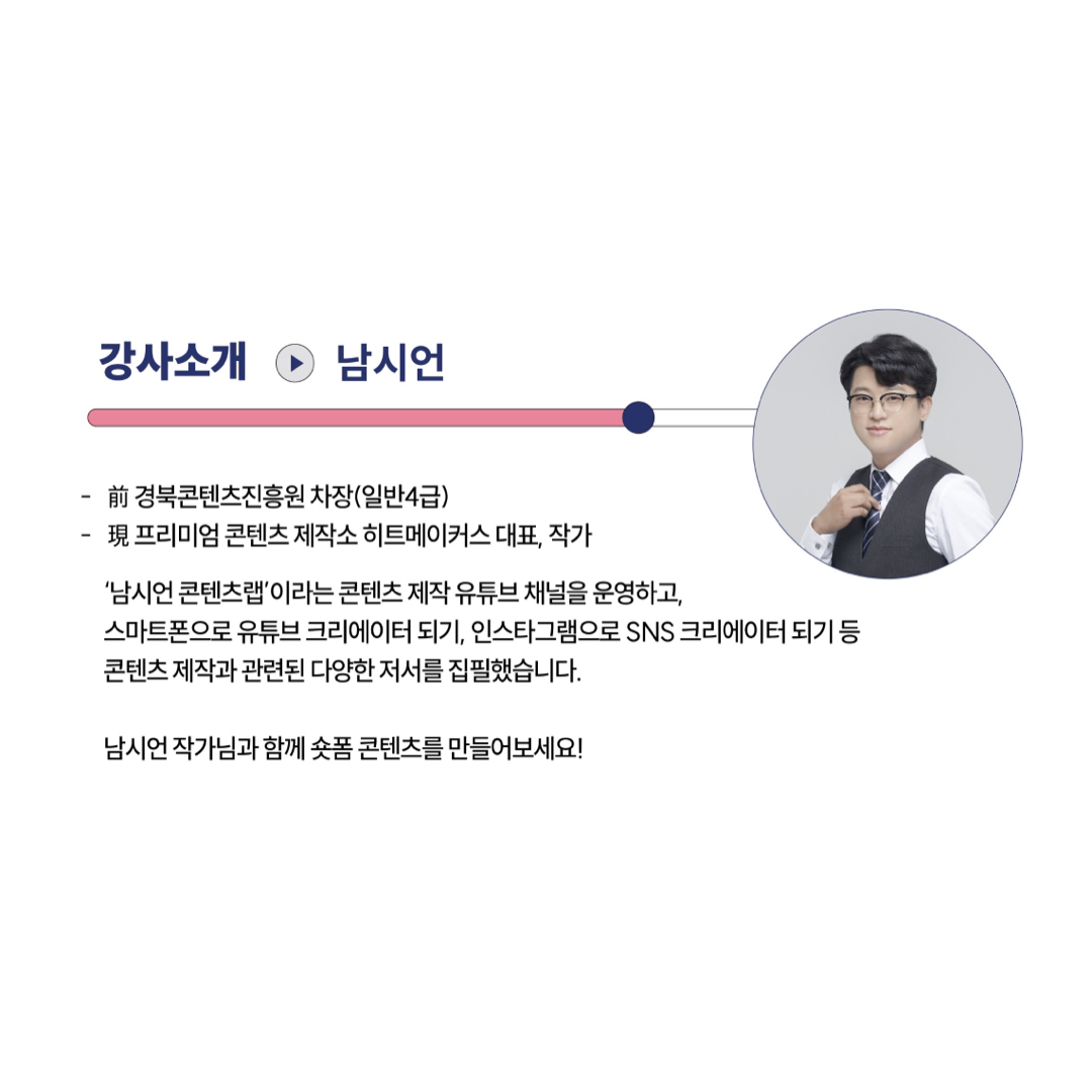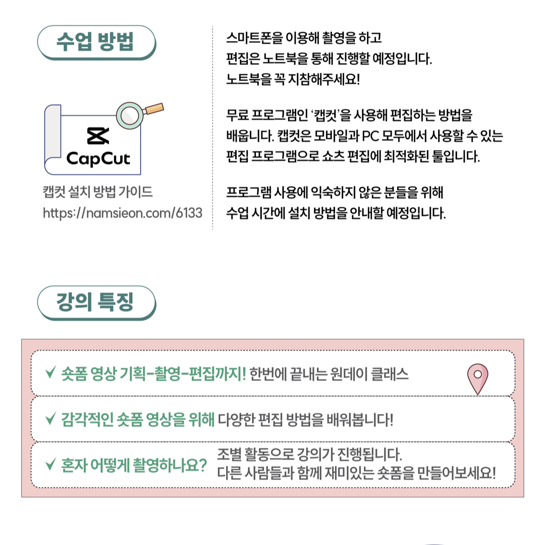 11월 15일 수요일에 진행되며, 10월 초에 진행했던 숏폼 제작 기초과정에서 이어지는 심화과정입니다. 지난번 숏폼 제작 기초과정이 열기가 굉장히 뜨거웠었던 덕분에 심화 과정도 개설이 되었습니다!