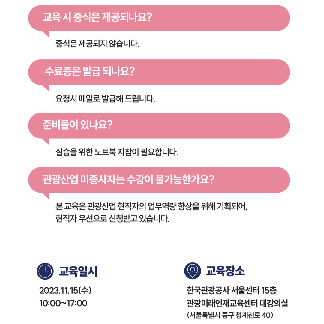 커리큘럼 및 자세한 내용은 이미지 참고해주시고, 계속 접수가 이뤄지고 있으므로 관광in 홈페이지에서 신청해주세요! 감사합니다!!