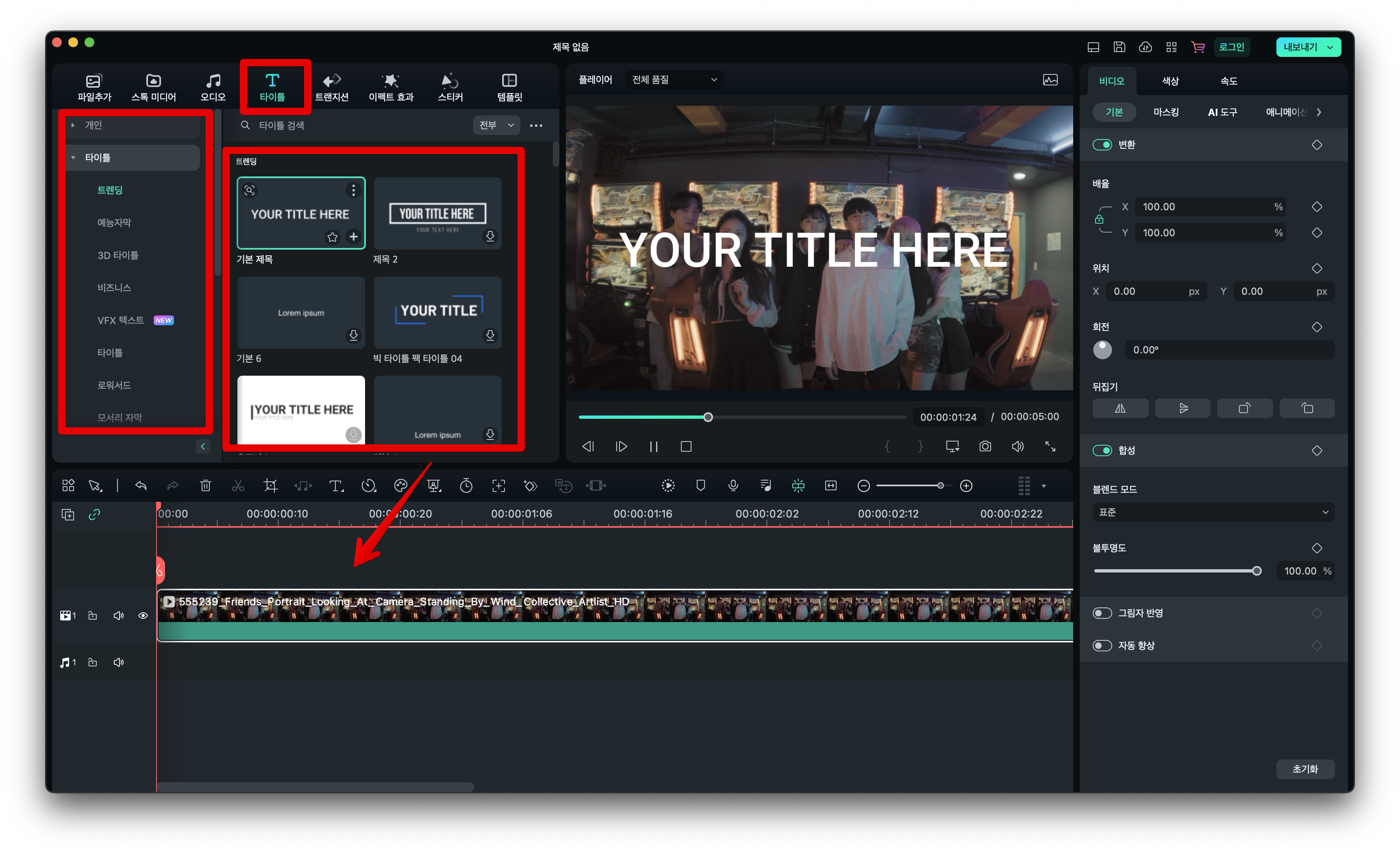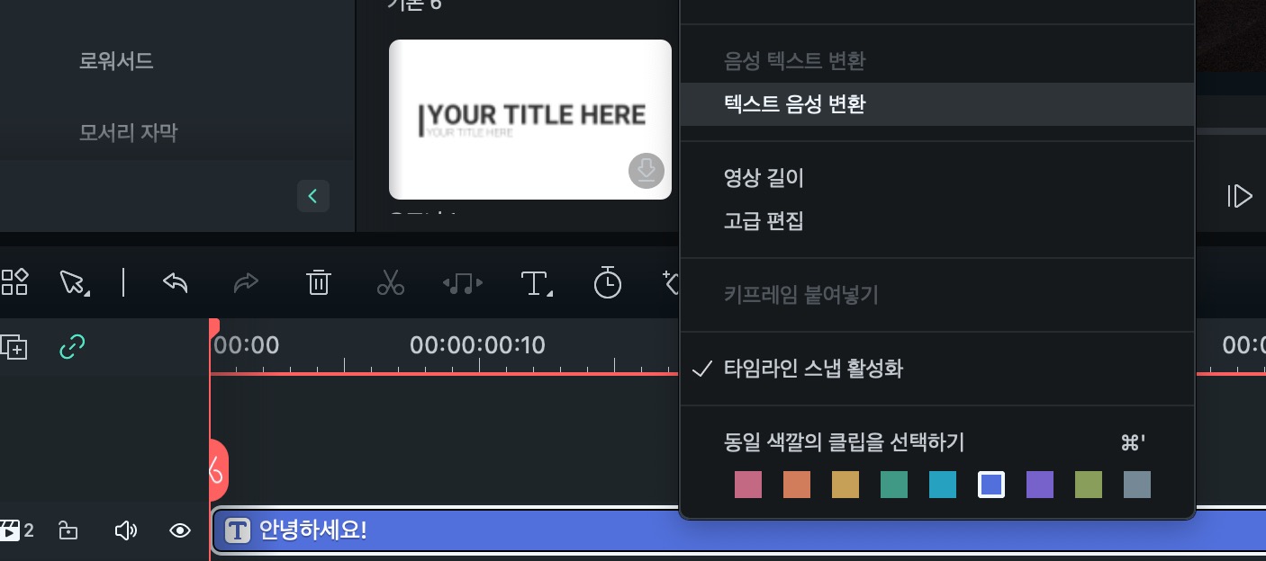 TTS 텍스트 음성변환을 하기 위해서는 먼저 텍스트를 입력을 해야하는데요. 필모라 편집 화면에서 상단 메뉴에 있는 [타이틀]로 들어가면 다양한 텍스트 템플릿들을 만나볼 수 있고 여기에서 원하는 객체를 선택한 후 타임라인에 추가해주는데, 이때 영상 위에 추가해줍니다.