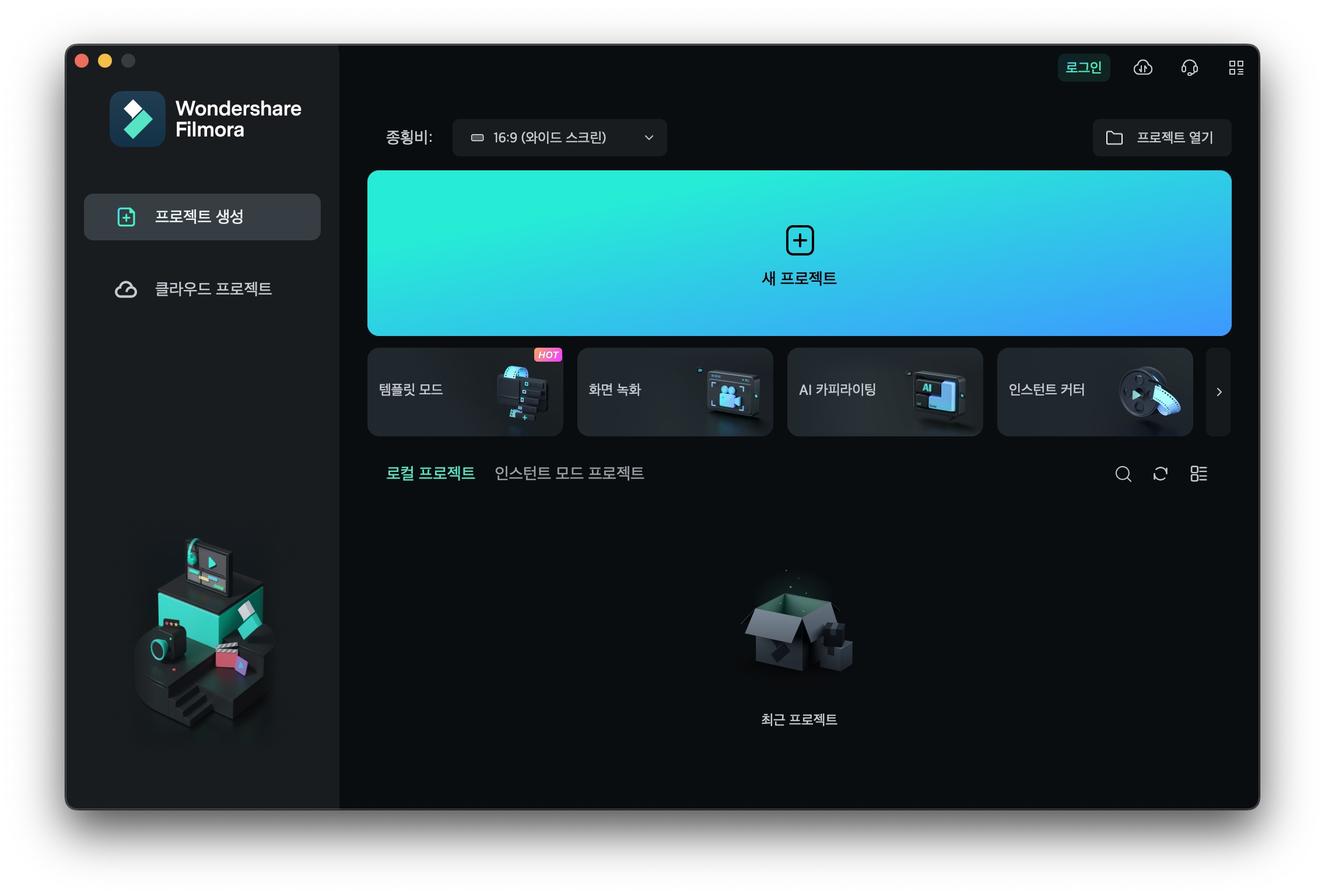 제일 먼저 필모라 프로그램을 실행시키고 프로젝트를 생성해줍니다.